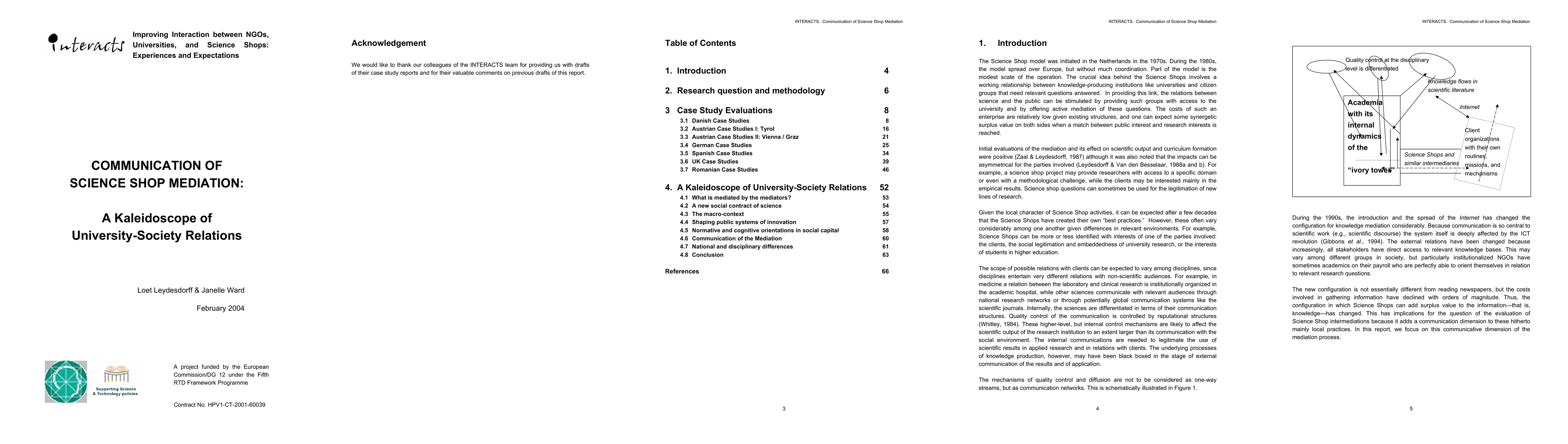 The Science Shop model was initiated in the Netherlands in the 1970s. Part of the model is the modest scale of the operation. The crucial idea behind the Science Shops involves a working relationship between knowledge-producing institutions like universities and citizen groups that need relevant questions answered. In providing this link, the relations between science and the public can be stimulated by providing such groups with access to the university and by offering active mediation of these questions. This research addresses the question of the external visibility of Science Shop work in terms of communications which reach beyond the local context of the participants. In addition to the question of the effects of this specific type of communication in terms of publications, institutional development, and curriculum development, we study the communication of the results in the press, the popular and grey literature, and other means of communication insofar as retrievable on distance through the Internet.