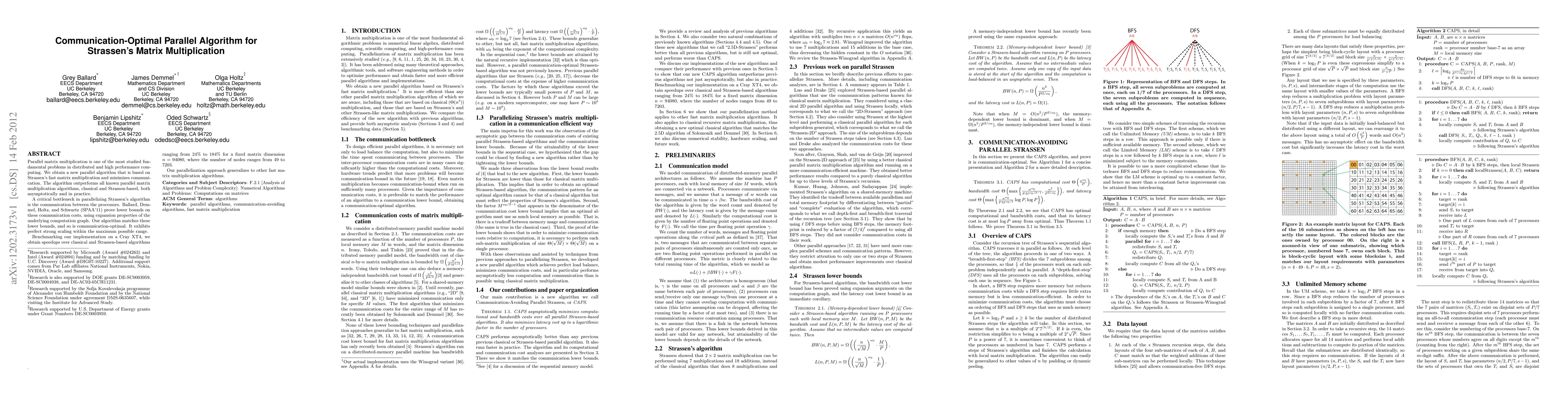 Parallel matrix multiplication is one of the most studied fundamental problems in distributed and high performance computing. We obtain a new parallel algorithm that is based on Strassen's fast matrix multiplication and minimizes communication. The algorithm outperforms all known parallel matrix multiplication algorithms, classical and Strassen-based, both asymptotically and in practice. A critical bottleneck in parallelizing Strassen's algorithm is the communication between the processors. Ballard, Demmel, Holtz, and Schwartz (SPAA'11) prove lower bounds on these communication costs, using expansion properties of the underlying computation graph. Our algorithm matches these lower bounds, and so is communication-optimal. It exhibits perfect strong scaling within the maximum possible range. Benchmarking our implementation on a Cray XT4, we obtain speedups over classical and Strassen-based algorithms ranging from 24% to 184% for a fixed matrix dimension n=94080, where the number of nodes ranges from 49 to 7203. Our parallelization approach generalizes to other fast matrix multiplication algorithms.
