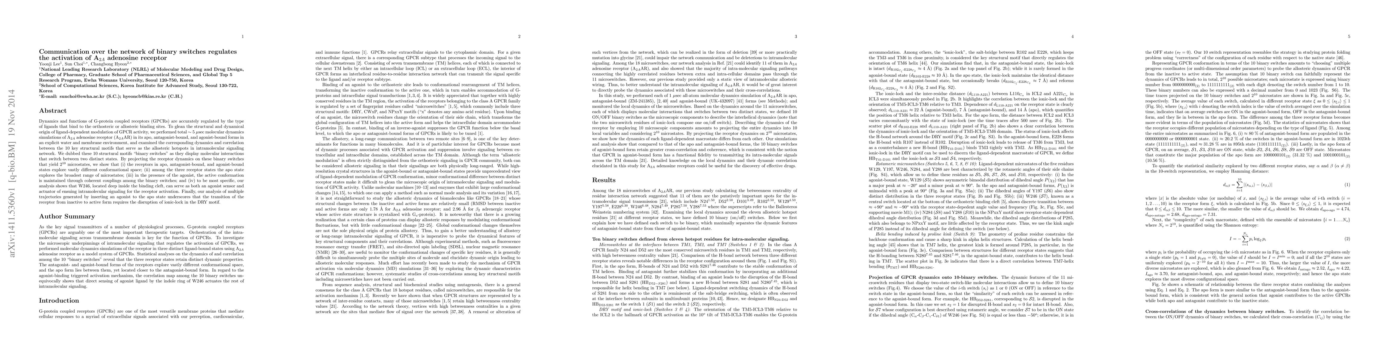 This study investigates the dynamics of the A$_{2A}$ adenosine receptor using molecular dynamics simulations to reveal how ligand binding modulates receptor activity through a network of 10 "binary switches" that regulate conformational changes. The findings indicate that the receptor's active conformation is maintained via coherent interactions among these switches, with W246 acting as a critical sensor and actuator in the signaling pathway.