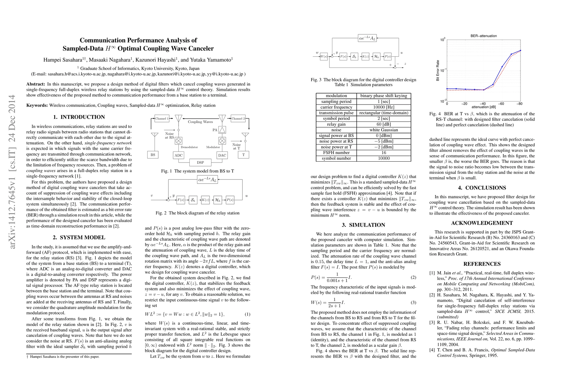 In this manuscript, we propose a design method of digital filters which cancel coupling waves generated in single-frequency full-duplex wireless relay stations by using the sampled-data H-infinity control theory. Simulation results show effectiveness of the proposed method to communication performance from a base station to a terminal.