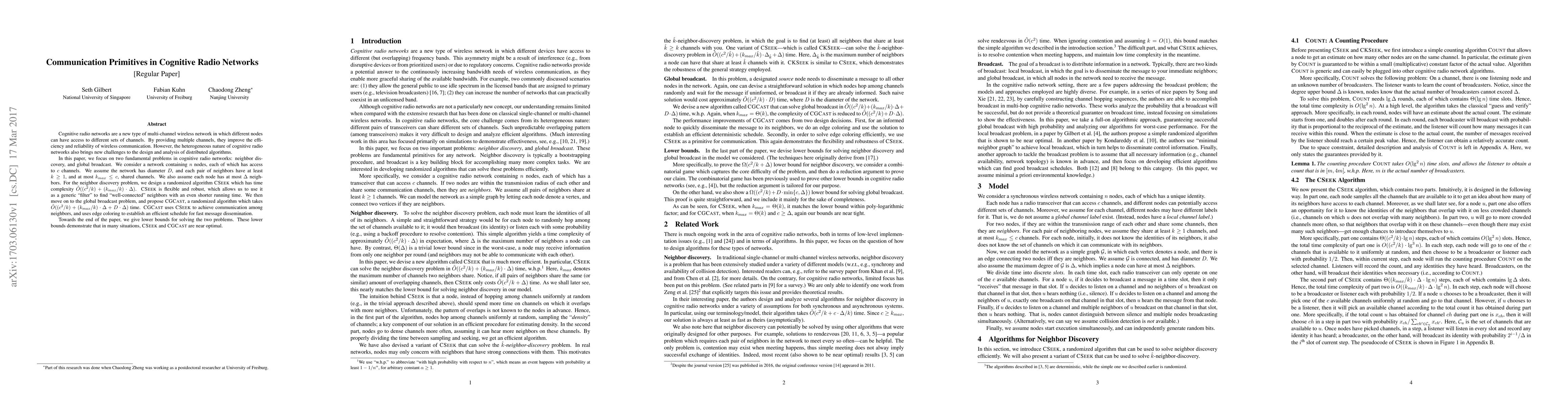 This paper addresses neighbor discovery and global broadcast in cognitive radio networks, proposing randomized algorithms CSeek and CGCast with time complexities $\tilde{O}((c^2/k)+(k_{max}/k)\cdot\Delta)$ and $\tilde{O}((c^2/k)+(k_{max}/k)\cdot\Delta+D\cdot\Delta)$, respectively. It also establishes lower bounds showing the near optimality of the proposed algorithms.