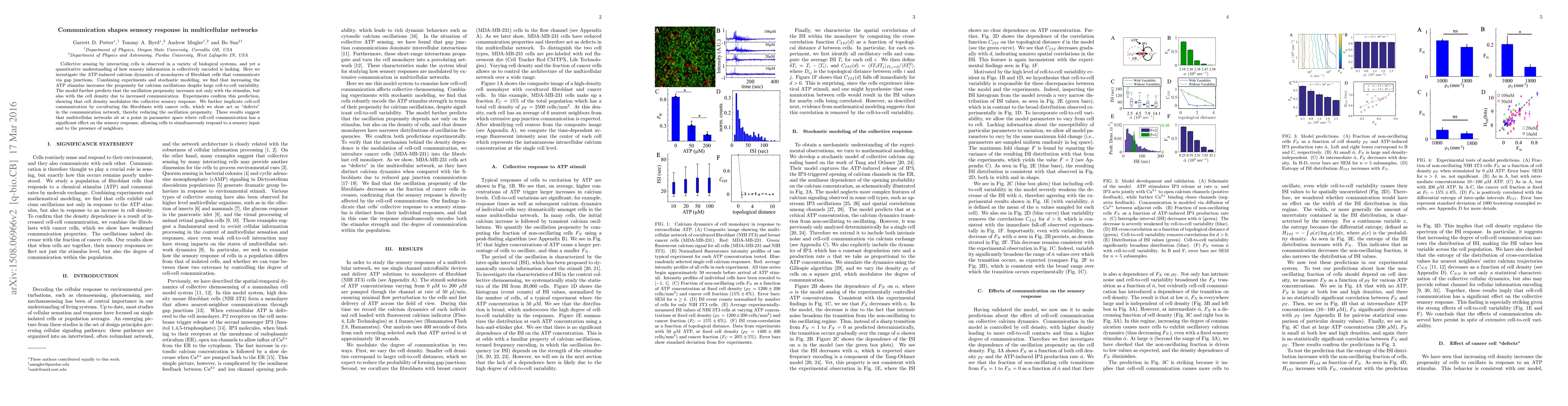 Collective sensing by interacting cells is observed in a variety of biological systems, and yet a quantitative understanding of how sensory information is collectively encoded is lacking. Here we investigate the ATP-induced calcium dynamics of monolayers of fibroblast cells that communicate via gap junctions. Combining experiments and stochastic modeling, we find that increasing the ATP stimulus increases the propensity for calcium oscillations despite large cell-to-cell variability. The model further predicts that the oscillation propensity increases not only with the stimulus, but also with the cell density due to increased communication. Experiments confirm this prediction, showing that cell density modulates the collective sensory response. We further implicate cell-cell communication by coculturing the fibroblasts with cancer cells, which we show act as "defects" in the communication network, thereby reducing the oscillation propensity. These results suggest that multicellular networks sit at a point in parameter space where cell-cell communication has a significant effect on the sensory response, allowing cells to simultaneously respond to a sensory input and to the presence of neighbors.