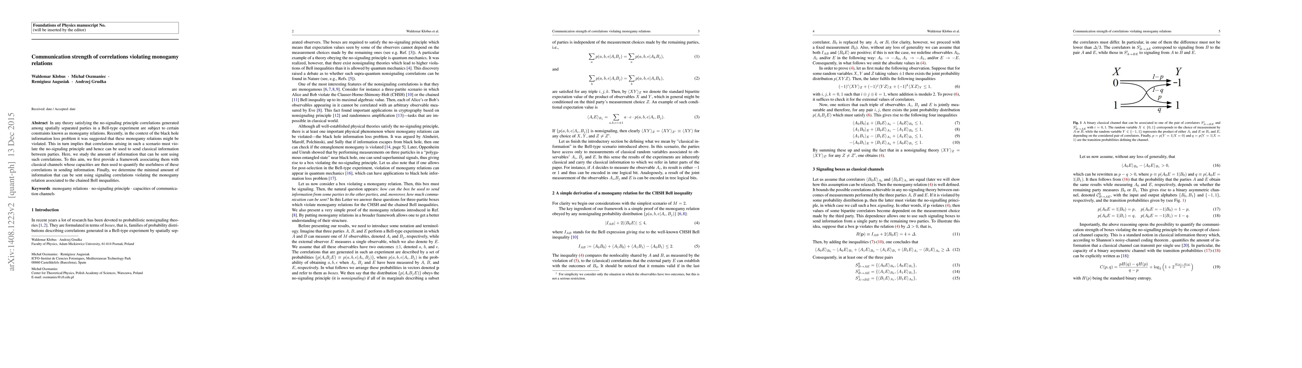 In any theory satisfying the no-signaling principle correlations generated among spatially separated parties in a Bell-type experiment are subject to certain constraints known as monogamy relations. Recently, in the context of the black hole information loss problem it was suggested that these monogamy relations might be violated. This in turn implies that correlations arising in such a scenario must violate the no-signaling principle and hence can be used to send classical information between parties. Here, we study the amount of information that can be sent using such correlations. To this aim, we first provide a framework associating them with classical channels whose capacities are then used to quantify the usefulness of these correlations in sending information. Finally, we determine the minimal amount of information that can be sent using signaling correlations violating the monogamy relation associated to the chained Bell inequalities.