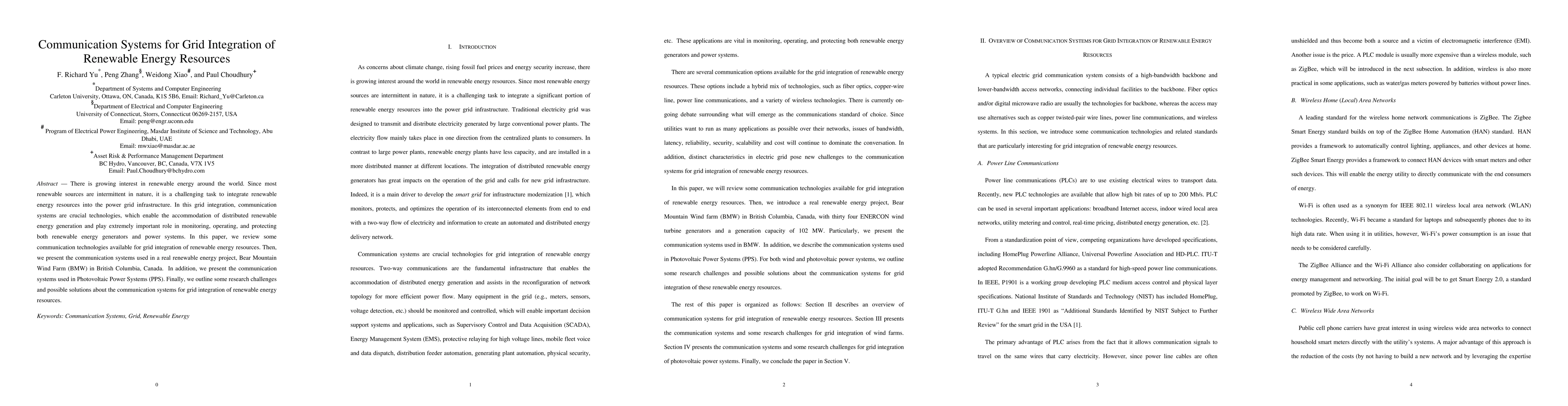 This paper reviews communication technologies for integrating renewable energy into power grids, focusing on systems used in the Bear Mountain Wind Farm and Photovoltaic Power Systems. It also discusses challenges and potential solutions for effective communication in renewable energy grid integration.