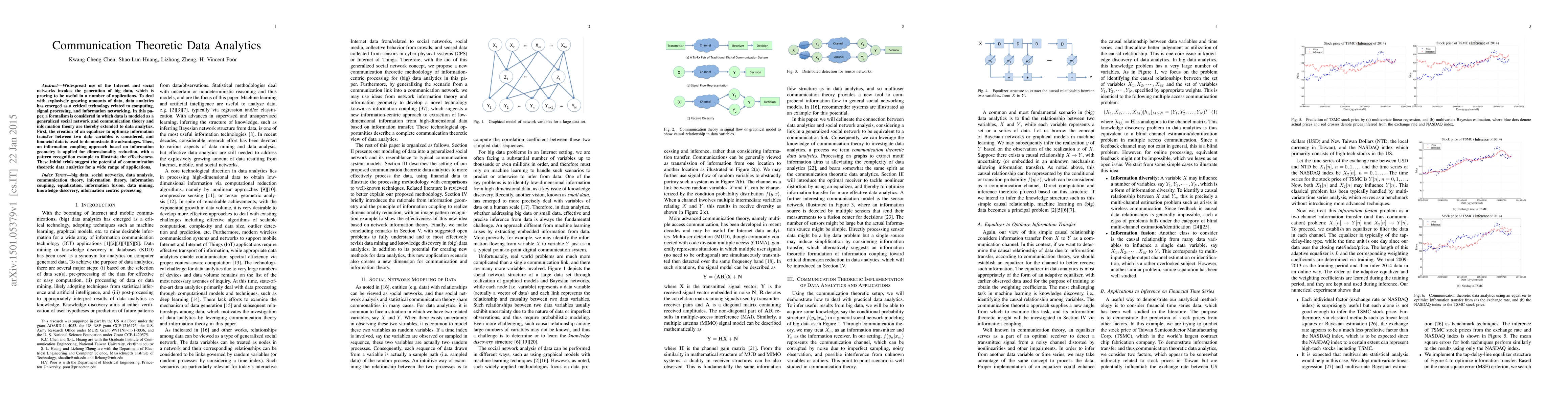 Widespread use of the Internet and social networks invokes the generation of big data, which is proving to be useful in a number of applications. To deal with explosively growing amounts of data, data analytics has emerged as a critical technology related to computing, signal processing, and information networking. In this paper, a formalism is considered in which data is modeled as a generalized social network and communication theory and information theory are thereby extended to data analytics. First, the creation of an equalizer to optimize information transfer between two data variables is considered, and financial data is used to demonstrate the advantages. Then, an information coupling approach based on information geometry is applied for dimensionality reduction, with a pattern recognition example to illustrate the effectiveness. These initial trials suggest the potential of communication theoretic data analytics for a wide range of applications.