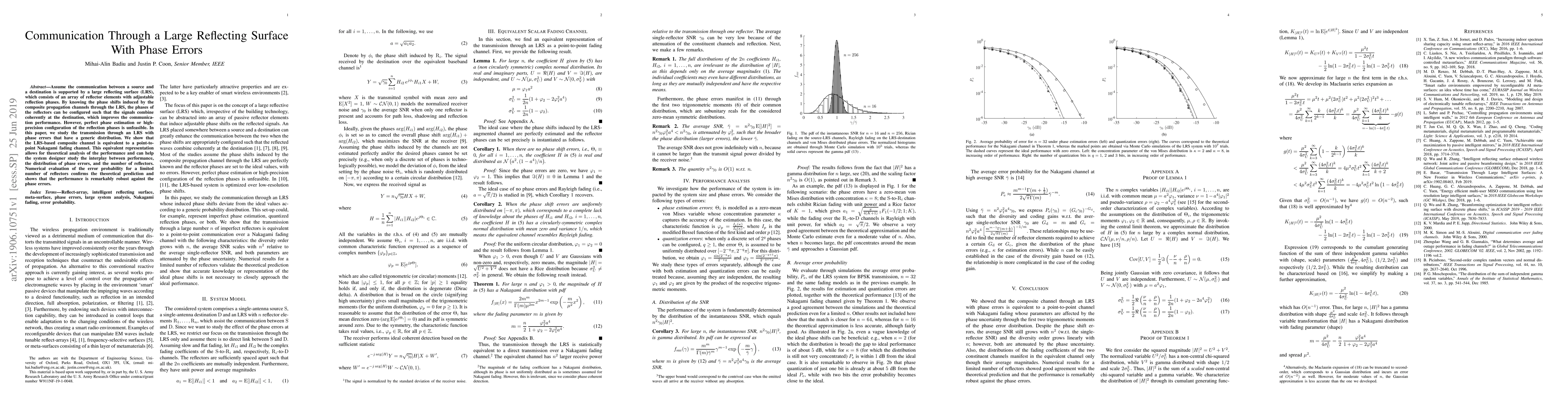 This paper investigates communication through a large reflecting surface (LRS) with adjustable reflection phases, focusing on the impact of phase errors. It demonstrates that despite phase errors, the LRS-based channel can be modeled as a point-to-point Nakagami fading channel, providing a robust theoretical framework for analyzing performance.