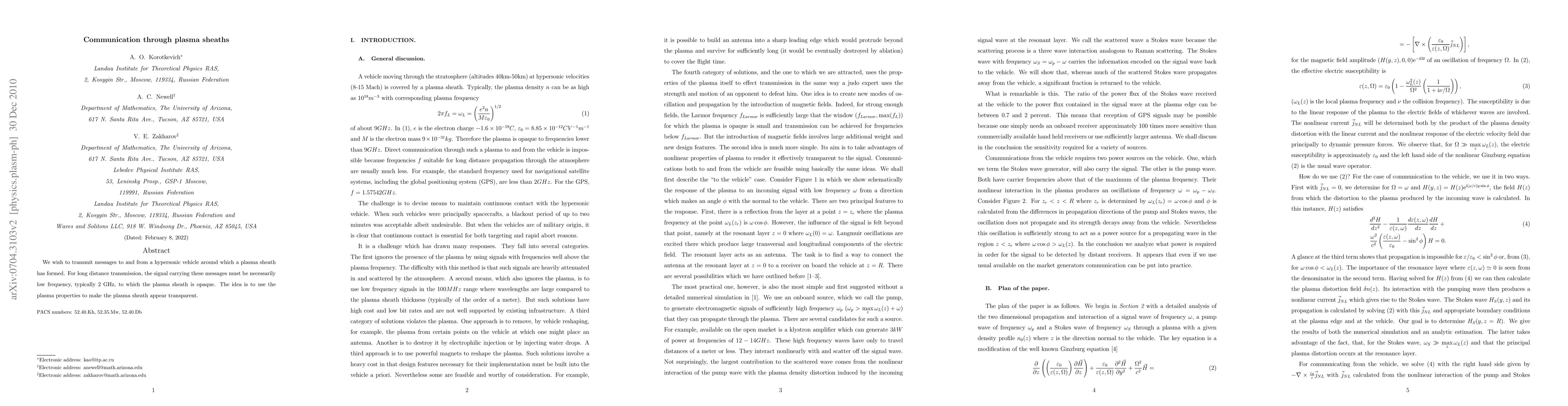 We wish to transmit messages to and from a hypersonic vehicle around which a plasma sheath has formed. For long distance transmission, the signal carrying these messages must be necessarily low frequency, typically 2 GHz, to which the plasma sheath is opaque. The idea is to use the plasma properties to make the plasma sheath appear transparent.