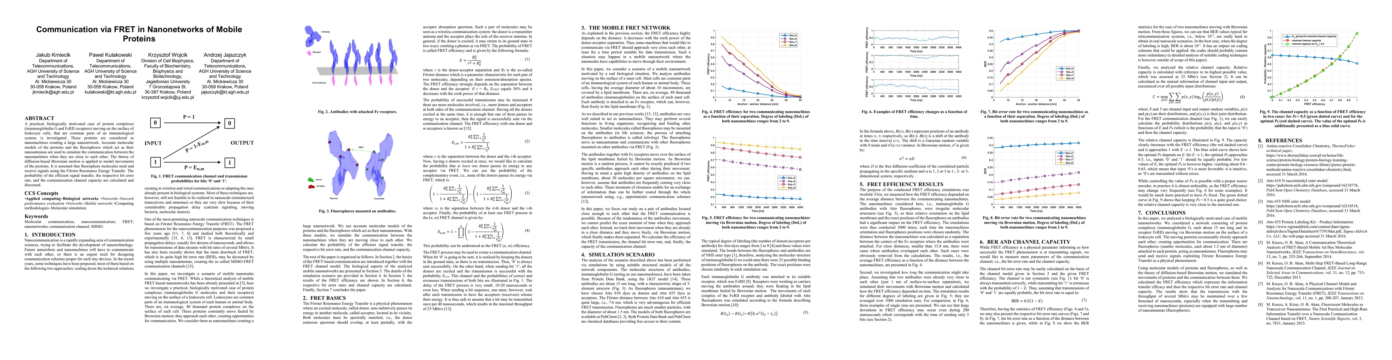 A practical, biologically motivated case of protein complexes (immunoglobulin G and FcRII receptors) moving on the surface of mastcells, that are common parts of an immunological system, is investigated. Proteins are considered as nanomachines creating a nanonetwork. Accurate molecular models of the proteins and the fluorophores which act as their nanoantennas are used to simulate the communication between the nanomachines when they are close to each other. The theory of diffusion-based Brownian motion is applied to model movements of the proteins. It is assumed that fluorophore molecules send and receive signals using the Forster Resonance Energy Transfer. The probability of the efficient signal transfer and the respective bit error rate are calculated and discussed.