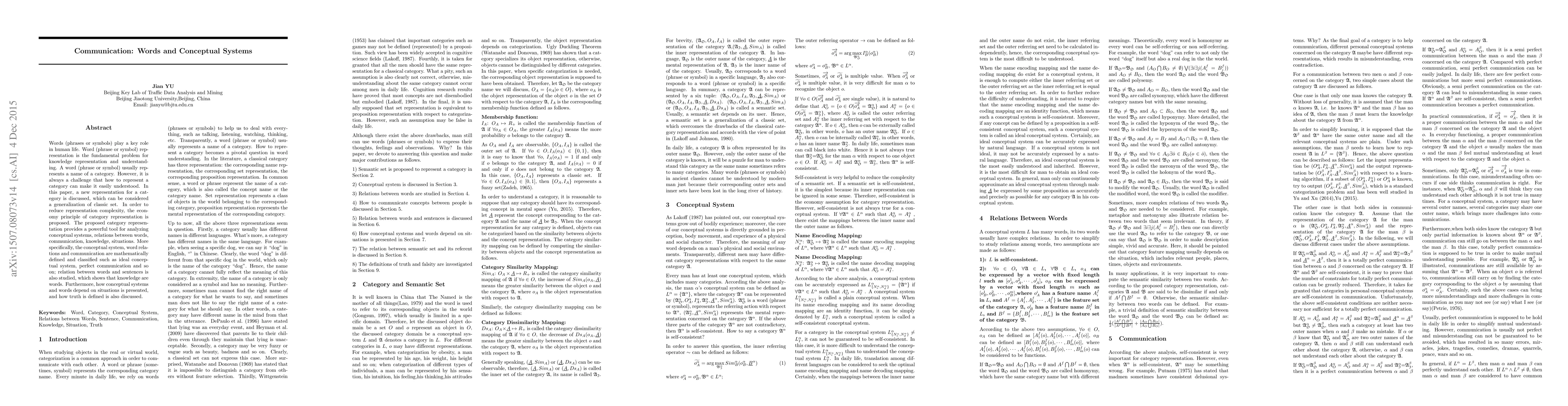 Words (phrases or symbols) play a key role in human life. Word (phrase or symbol) representation is the fundamental problem for knowledge representation and understanding. A word (phrase or symbol) usually represents a name of a category. However, it is always a challenge that how to represent a category can make it easily understood. In this paper, a new representation for a category is discussed, which can be considered a generalization of classic set. In order to reduce representation complexity, the economy principle of category representation is proposed. The proposed category representation provides a powerful tool for analyzing conceptual systems, relations between words, communication, knowledge, situations. More specifically, the conceptual system, word relations and communication are mathematically defined and classified such as ideal conceptual system, perfect communication and so on; relation between words and sentences is also studied, which shows that knowledge are words. Furthermore, how conceptual systems and words depend on situations is presented, and how truth is defined is also discussed.