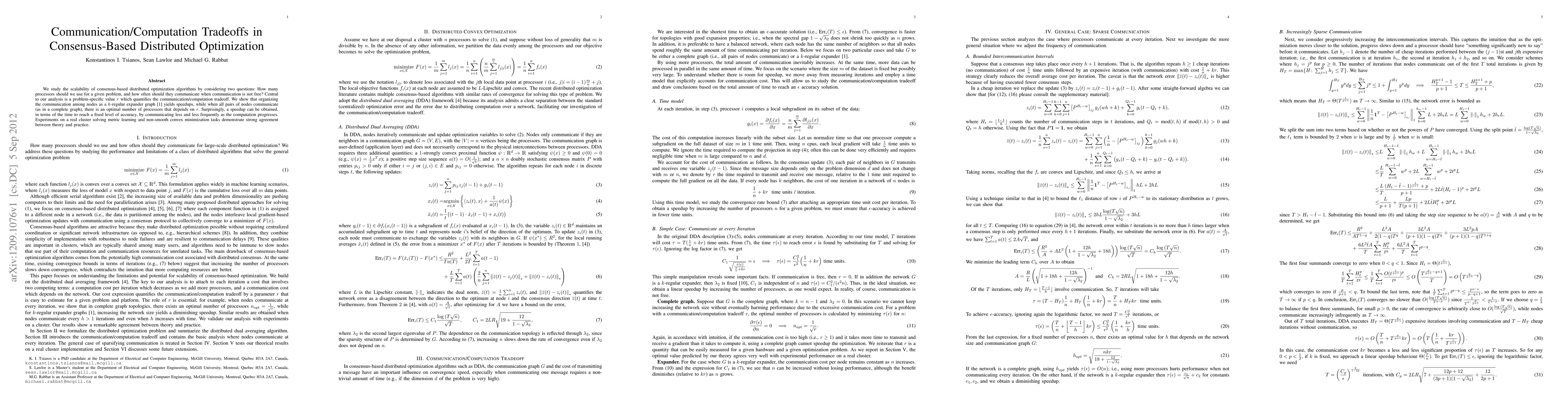 This paper investigates the scalability of consensus-based distributed optimization algorithms, focusing on the communication/computation tradeoff. It finds that using a $k$-regular expander graph for communication can yield speedups, while complete graph communication has an optimal processor count dependent on a problem-specific value $r$. Experiments show that less frequent communication can improve efficiency.