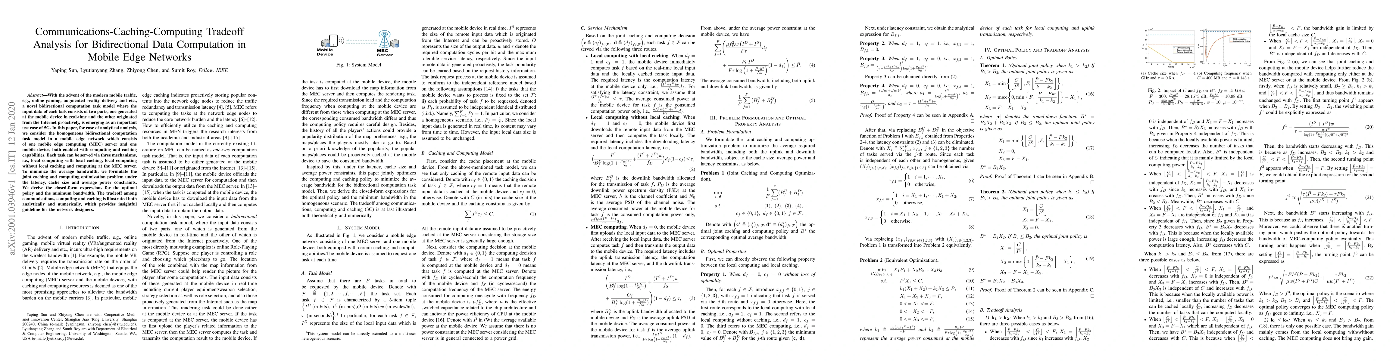 This paper analyzes the tradeoff between communications, computing, and caching in mobile edge networks for bidirectional data computation tasks, optimizing bandwidth under latency, cache size, and power constraints. It derives optimal policies and provides insights for network design through analytical and numerical methods.