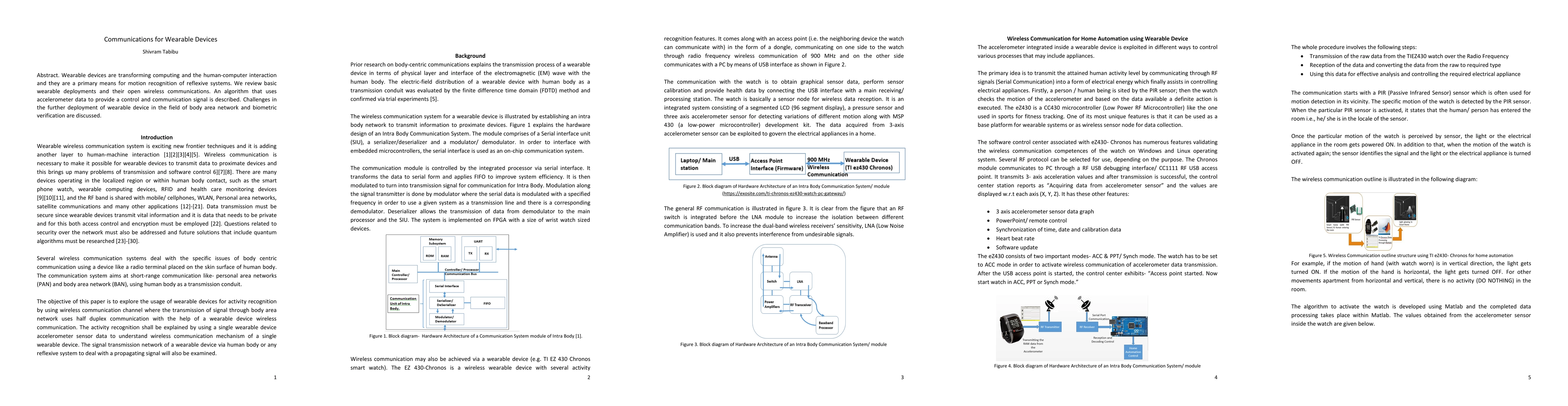 This paper reviews the current state of wearable devices in computing and human-computer interaction, focusing on their wireless communication methods and an algorithm for control and communication using accelerometer data. It also discusses challenges for future deployment in body area networks and biometric verification.