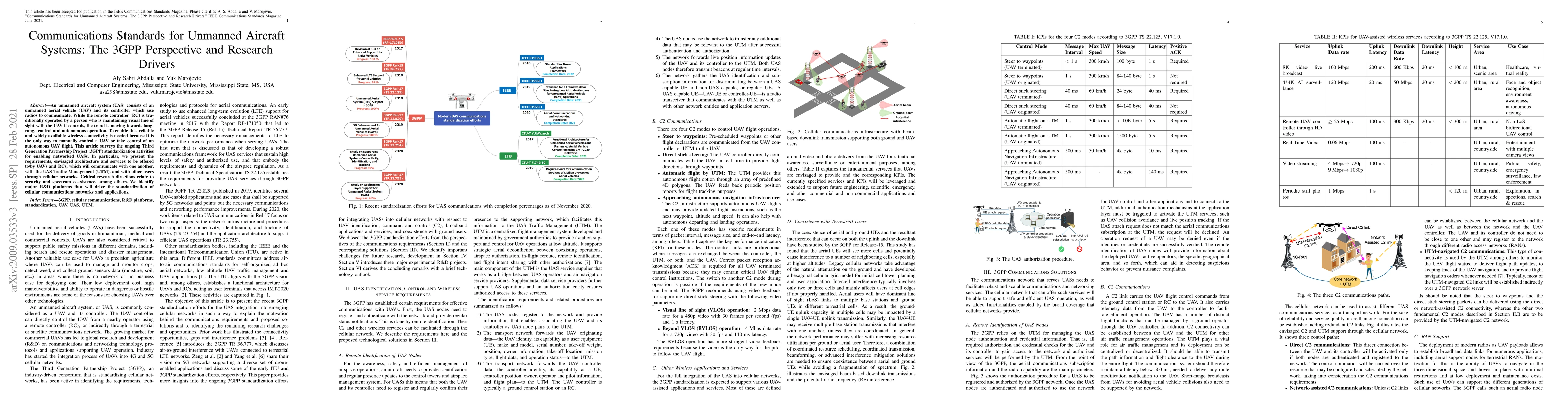 This paper surveys 3GPP's efforts to standardize communications for unmanned aircraft systems (UAS), focusing on requirements for reliable connectivity, envisioned architecture, and services. Key research areas include security and spectrum coexistence, with major R&D platforms identified to drive future cellular network and application standardization.