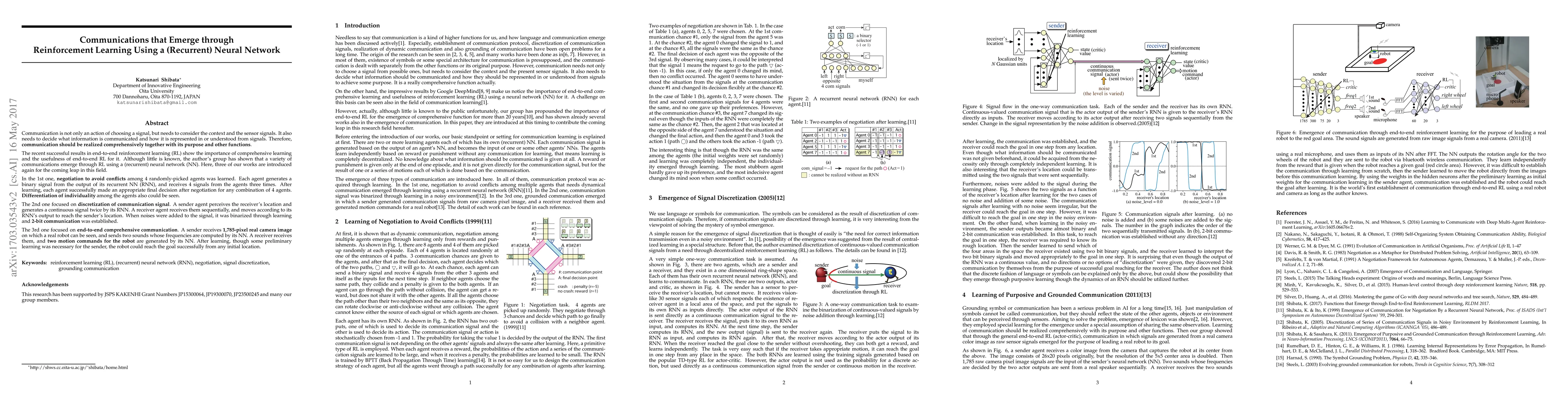 Communication is not only an action of choosing a signal, but needs to consider the context and sensor signals. It also needs to decide what information is communicated and how it is represented in or understood from signals. Therefore, communication should be realized comprehensively together with its purpose and other functions. The recent successful results in end-to-end reinforcement learning (RL) show the importance of comprehensive learning and the usefulness of end-to-end RL. Although little is known, we have shown that a variety of communications emerge through RL using a (recurrent) neural network (NN). Here, three of them are introduced. In the 1st one, negotiation to avoid conflicts among 4 randomly-picked agents was learned. Each agent generates a binary signal from the output of its recurrent NN (RNN), and receives 4 signals from the agents three times. After learning, each agent made an appropriate final decision after negotiation for any combination of 4 agents. Differentiation of individuality among the agents also could be seen. The 2nd one focused on discretization of communication signal. A sender agent perceives the receiver's location and generates a continuous signal twice by its RNN. A receiver agent receives them sequentially, and moves according to its RNN's output to reach the sender's location. When noises were added to the signal, it was binarized through learning and 2-bit communication was established. The 3rd one focused on end-to-end comprehensive communication. A sender receives 1,785-pixel real camera image on which a real robot can be seen, and sends two sounds whose frequencies are computed by its NN. A receiver receives them, and two motion commands for the robot are generated by its NN. After learning, though some preliminary learning was necessary for the sender, the robot could reach the goal from any initial location.