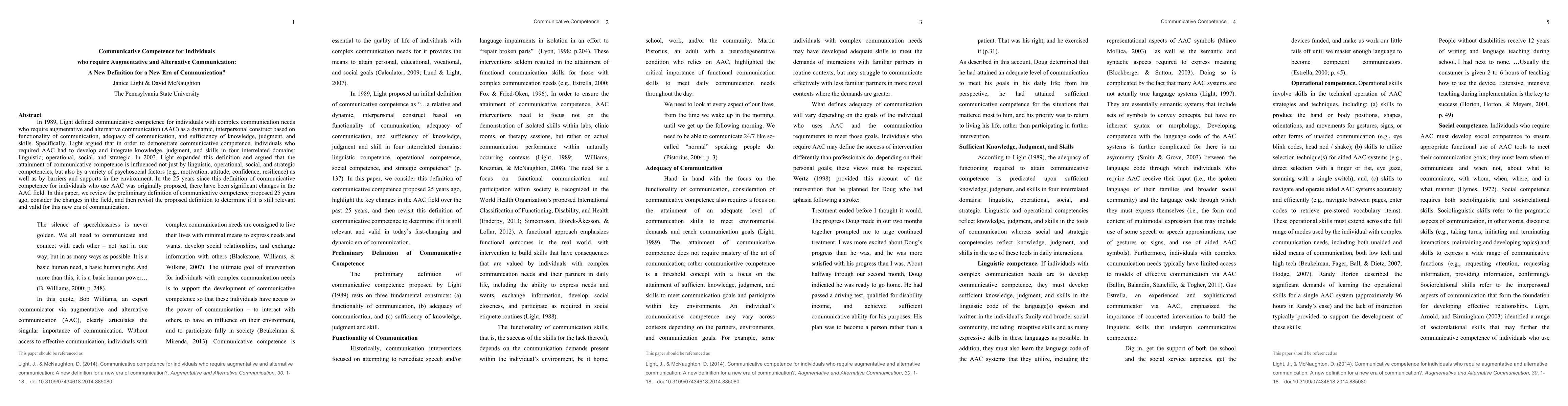 In 1989, Light defined communicative competence for individuals with complex communication needs who require augmentative and alternative communication (AAC) as a dynamic, interpersonal construct based on functionality of communication, adequacy of communication, and sufficiency of knowledge, judgment, and skills. Specifically, Light argued that in order to demonstrate communicative competence, individuals who required AAC had to develop and integrate knowledge, judgment, and skills in four interrelated domains: linguistic, operational, social, and strategic. In 2003, Light expanded this definition and argued that the attainment of communicative competence is influenced not just by linguistic, operational, social, and strategic competencies, but also by a variety of psychosocial factors (e.g., motivation, attitude, confidence, resilience) as well as by barriers and supports in the environment. In the 25 years since this definition of communicative competence for individuals who use AAC was originally proposed, there have been significant changes in the AAC field. In this paper, we review the preliminary definition of communicative competence proposed 25 years ago, consider the changes in the field, and then revisit the proposed definition to determine if it is still relevant and valid for this new era of communication.