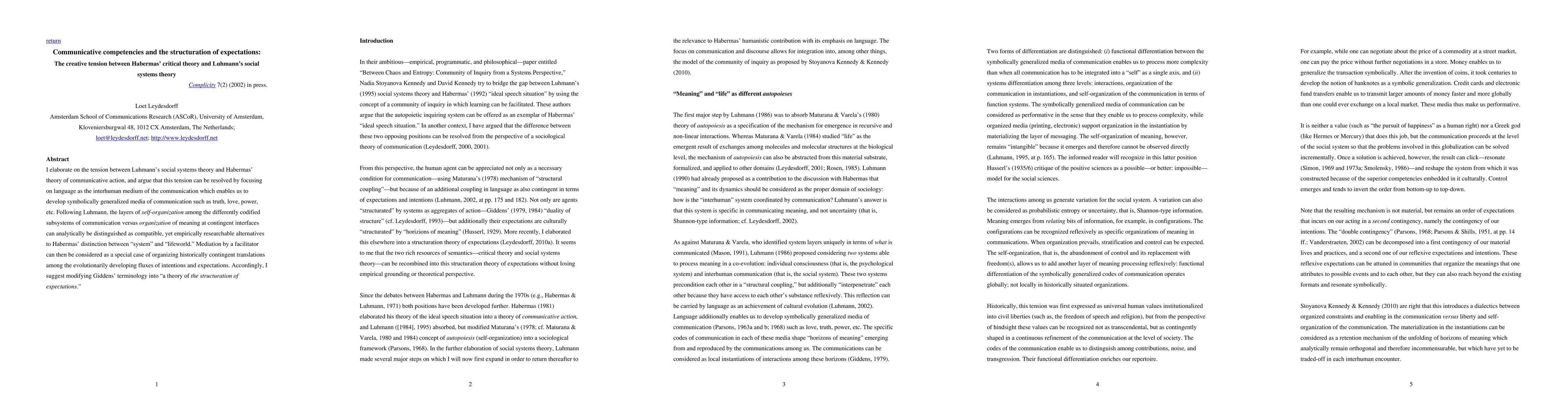 I elaborate on the tension between Luhmann's social systems theory and Habermas' theory of communicative action, and argue that this tension can be resolved by focusing on language as the interhuman medium of the communication which enables us to develop symbolically generalized media of communication such as truth, love, power, etc. Following Luhmann, the layers of self-organization among the differently codified subsystems of communication versus organization of meaning at contingent interfaces can analytically be distinguished as compatible, yet empirically researchable alternatives to Habermas' distinction between "system" and "lifeworld." Mediation by a facilitator can then be considered as a special case of organizing historically contingent translations among the evolutionarily developing fluxes of intentions and expectations. Accordingly, I suggest modifying Giddens' terminology into "a theory of the structuration of expectations."