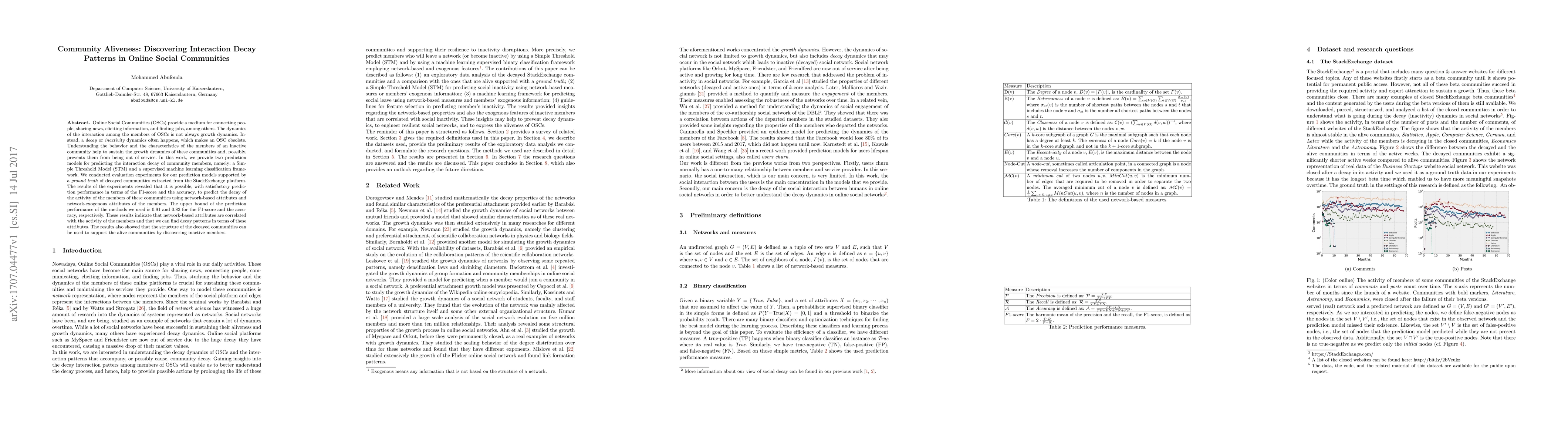 Online Social Communities (OSCs) provide a medium for connecting people, sharing news, eliciting information, and finding jobs, among others. The dynamics of the interaction among the members of OSCs is not always growth dynamics. Instead, a $\textit{decay}$ or $\textit{inactivity}$ dynamics often happens, which makes an OSC obsolete. Understanding the behavior and the characteristics of the members of an inactive community help to sustain the growth dynamics of these communities and, possibly, prevents them from being out of service. In this work, we provide two prediction models for predicting the interaction decay of community members, namely: a Simple Threshold Model (STM) and a supervised machine learning classification framework. We conducted evaluation experiments for our prediction models supported by a $\textit{ground truth}$ of decayed communities extracted from the StackExchange platform. The results of the experiments revealed that it is possible, with satisfactory prediction performance in terms of the F1-score and the accuracy, to predict the decay of the activity of the members of these communities using network-based attributes and network-exogenous attributes of the members. The upper bound of the prediction performance of the methods we used is $0.91$ and $0.83$ for the F1-score and the accuracy, respectively. These results indicate that network-based attributes are correlated with the activity of the members and that we can find decay patterns in terms of these attributes. The results also showed that the structure of the decayed communities can be used to support the alive communities by discovering inactive members.