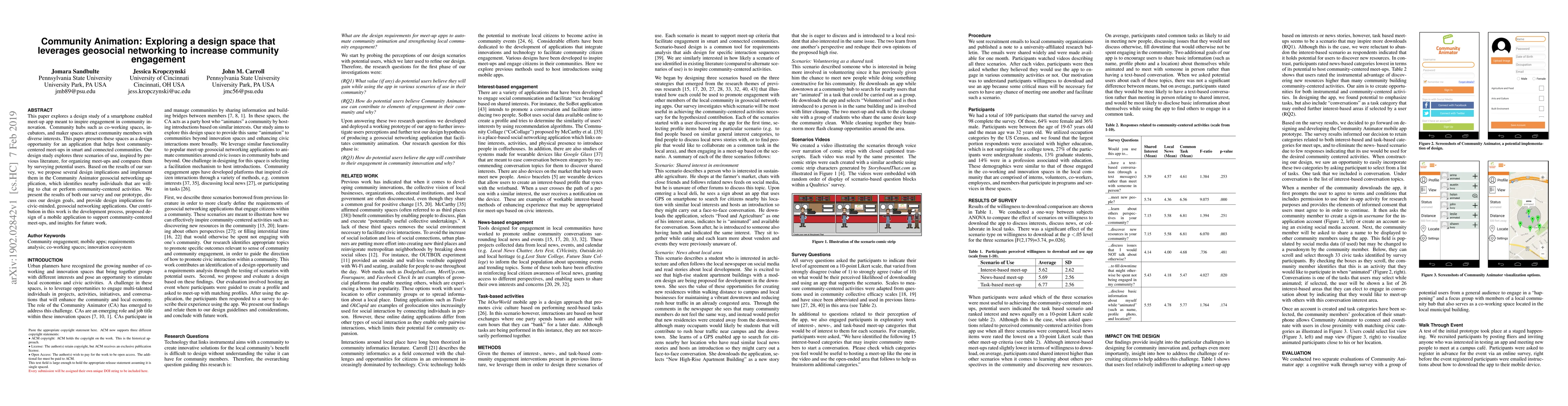 This paper explores a design study of a smartphone enabled meet-up app meant to inspire engagement in community innovation. Community hubs such as co-working spaces, incubators, and maker spaces attract community members with diverse interests. This paper presents these spaces as a design opportunity for an application that helps host community-centered meet-ups in smart and connected communities. Our design study explores three scenarios of use, inspired by previous literature, for organizing meet-ups and compares them by surveying potential users. Based on the results of our survey, we propose several design implications and implement them in the Community Animator geosocial networking application, which identifies nearby individuals that are willing to chat or perform community-centered activities. We present the results of both our survey and our prototype, discuss our design goals, and provide design implications for civic-minded, geosocial networking applications. Our contribution in this work is the development process, proposed design of a mobile application to support community-centered meet-ups, and insights for future work.