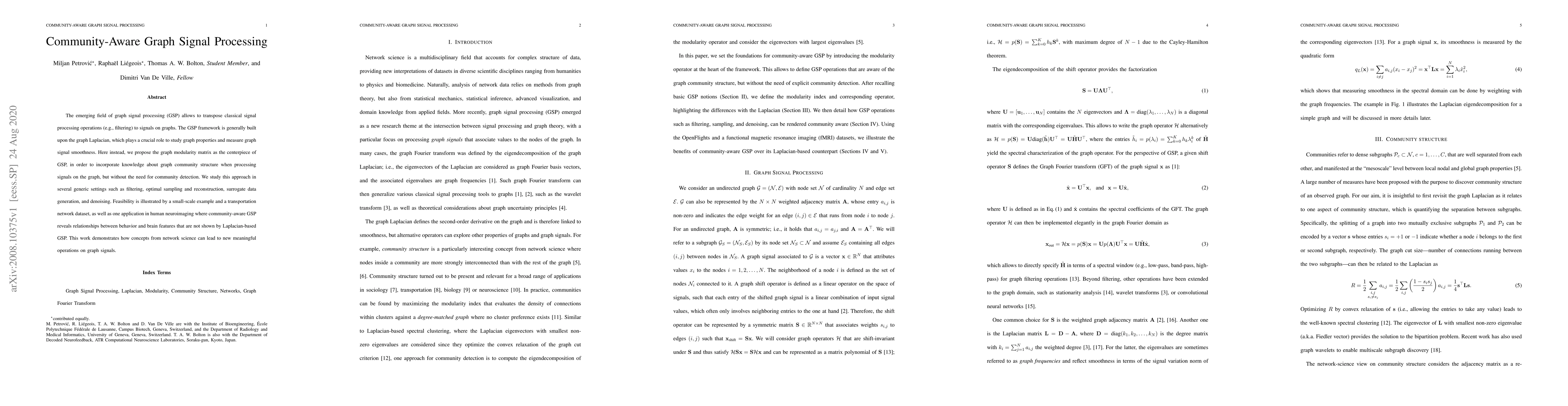 This paper proposes using the graph modularity matrix in graph signal processing (GSP) to incorporate community structure without explicit community detection, enhancing operations like filtering and denoising. It demonstrates feasibility through applications in transportation networks and human neuroimaging, showing improved insights compared to traditional Laplacian-based GSP.