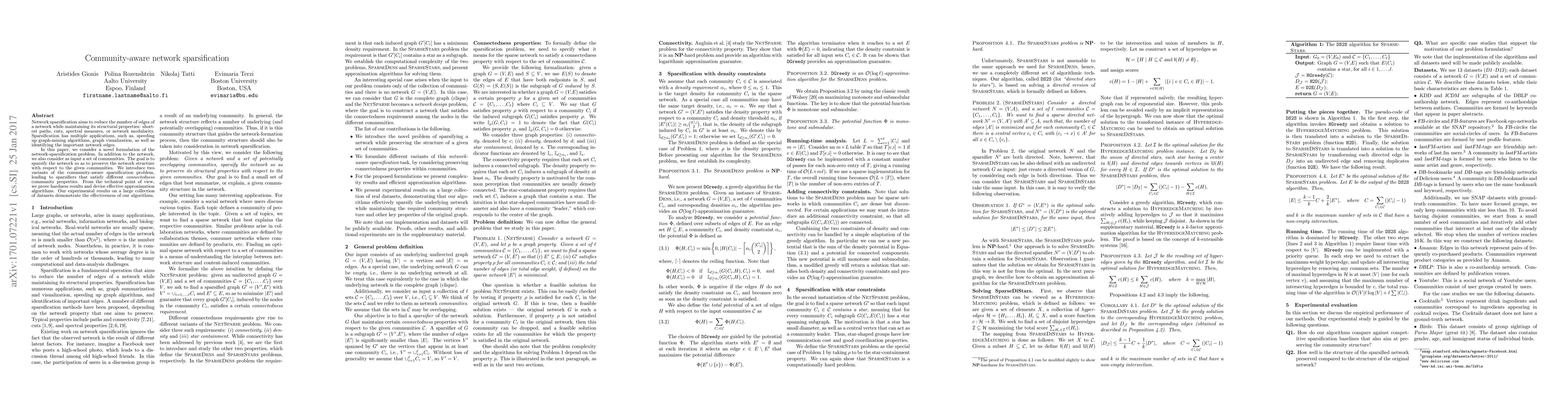 This paper proposes a novel community-aware network sparsification approach that aims to reduce the number of edges while preserving structural properties with respect to given communities. It introduces two variants of the problem and presents effective algorithms, supported by experimental results showing their effectiveness.