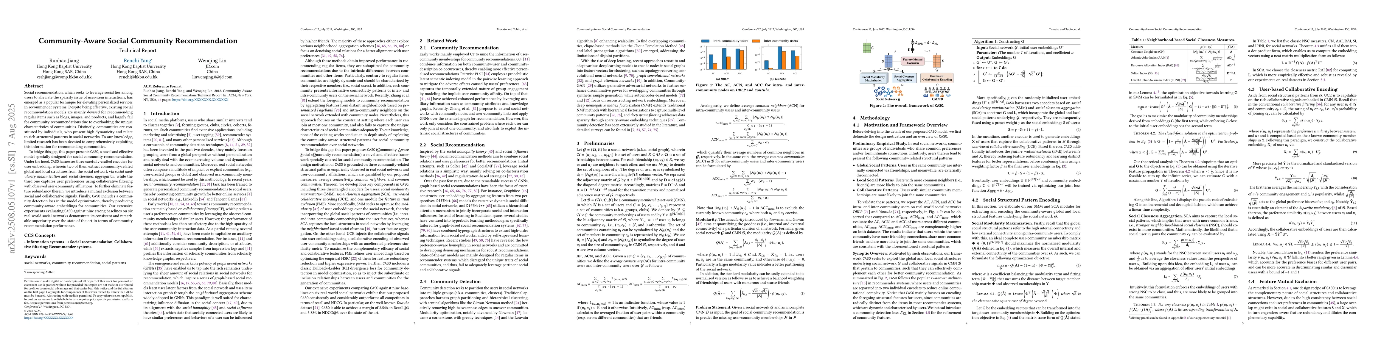 Social recommendation, which seeks to leverage social ties among users to alleviate the sparsity issue of user-item interactions, has emerged as a popular technique for elevating personalized services in recommender systems. Despite being effective, existing social recommendation models are mainly devised for recommending regular items such as blogs, images, and products, and largely fail for community recommendations due to overlooking the unique characteristics of communities. Distinctly, communities are constituted by individuals, who present high dynamicity and relate to rich structural patterns in social networks. To our knowledge, limited research has been devoted to comprehensively exploiting this information for recommending communities. To bridge this gap, this paper presents CASO, a novel and effective model specially designed for social community recommendation. Under the hood, CASO harnesses three carefully-crafted encoders for user embedding, wherein two of them extract community-related global and local structures from the social network via social modularity maximization and social closeness aggregation, while the third one captures user preferences using collaborative filtering with observed user-community affiliations. To further eliminate feature redundancy therein, we introduce a mutual exclusion between social and collaborative signals. Finally, CASO includes a community detection loss in the model optimization, thereby producing community-aware embeddings for communities. Our extensive experiments evaluating CASO against nine strong baselines on six real-world social networks demonstrate its consistent and remarkable superiority over the state of the art in terms of community recommendation performance.