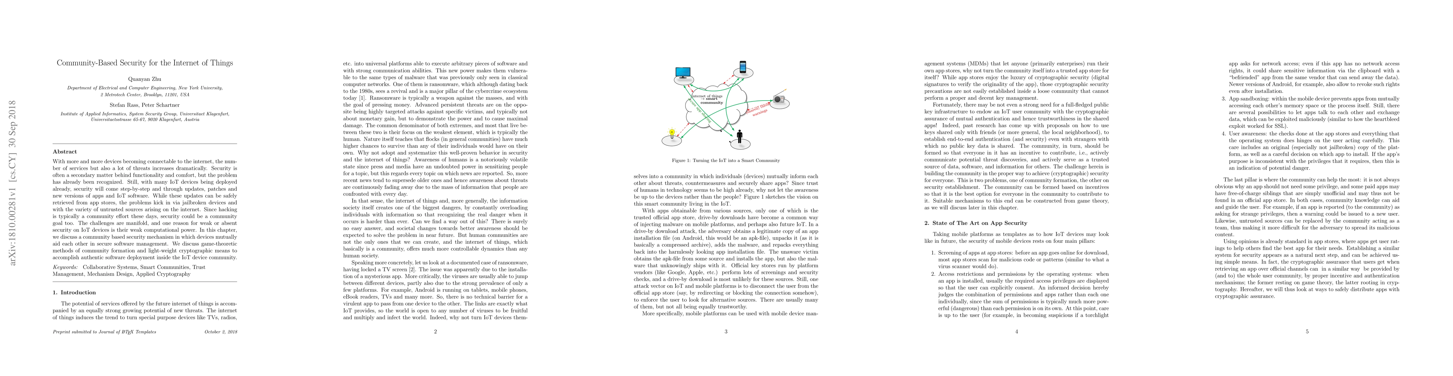 This paper explores community-based security mechanisms for IoT devices, emphasizing mutual aid in secure software management. It proposes game-theoretic methods for community formation and lightweight cryptographic techniques to ensure authentic software deployment, addressing the challenges posed by weak computational power and untrusted sources.