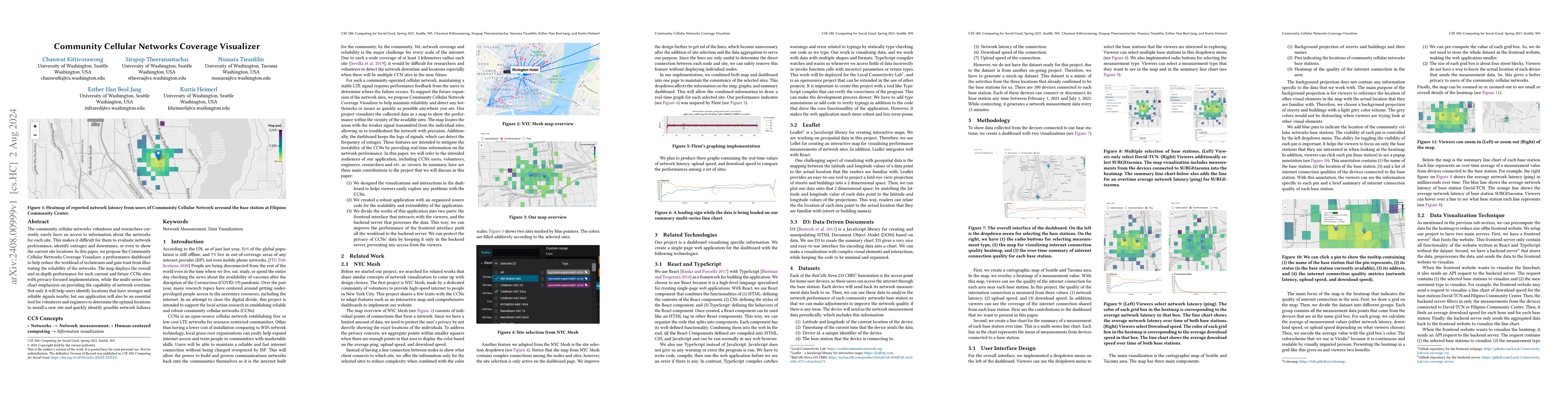 Title: Community Cellular Networks Coverage Visualizer Summary: This study introduces a performance dashboard that visualizes the reliability and performance of community cellular networks, aiding technicians and volunteers in identifying optimal site locations and network failures while maintaining privacy.