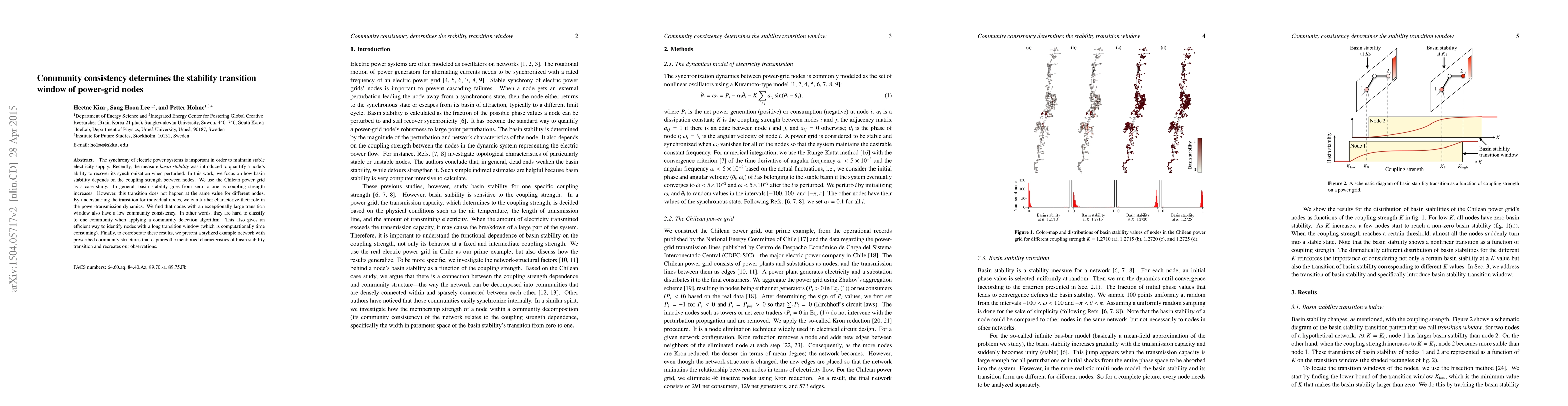 The synchrony of electric power systems is important in order to maintain stable electricity supply. Recently, the measure basin stability was introduced to quantify a node's ability to recover its synchronization when perturbed. In this work, we focus on how basin stability depends on the coupling strength between nodes. We use the Chilean power grid as a case study. In general, basin stability goes from zero to one as coupling strength increases. However, this transition does not happen at the same value for different nodes. By understanding the transition for individual nodes, we can further characterize their role in the power-transmission dynamics. We find that nodes with an exceptionally large transition window also have a low community consistency. In other words, they are hard to classify to one community when applying a community detection algorithm. This also gives an efficient way to identify nodes with a long transition window (which is computationally time consuming). Finally, to corroborate these results, we present a stylized example network with prescribed community structures that captures the mentioned characteristics of basin stability transition and recreates our observations.