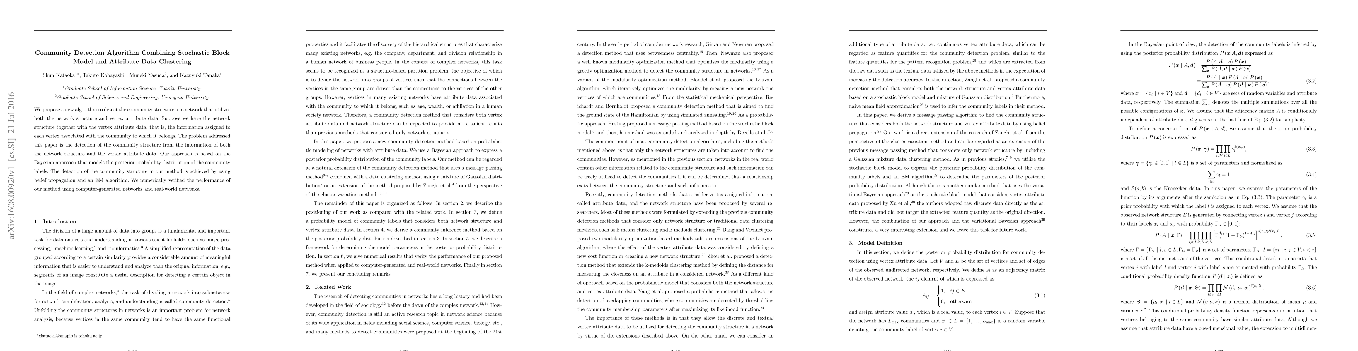 This paper introduces a novel algorithm that combines the Stochastic Block Model with vertex attribute data clustering to detect community structures in networks. The method uses a Bayesian approach, belief propagation, and an EM algorithm to model the posterior probability distribution of community labels, validated through both synthetic and real-world networks.