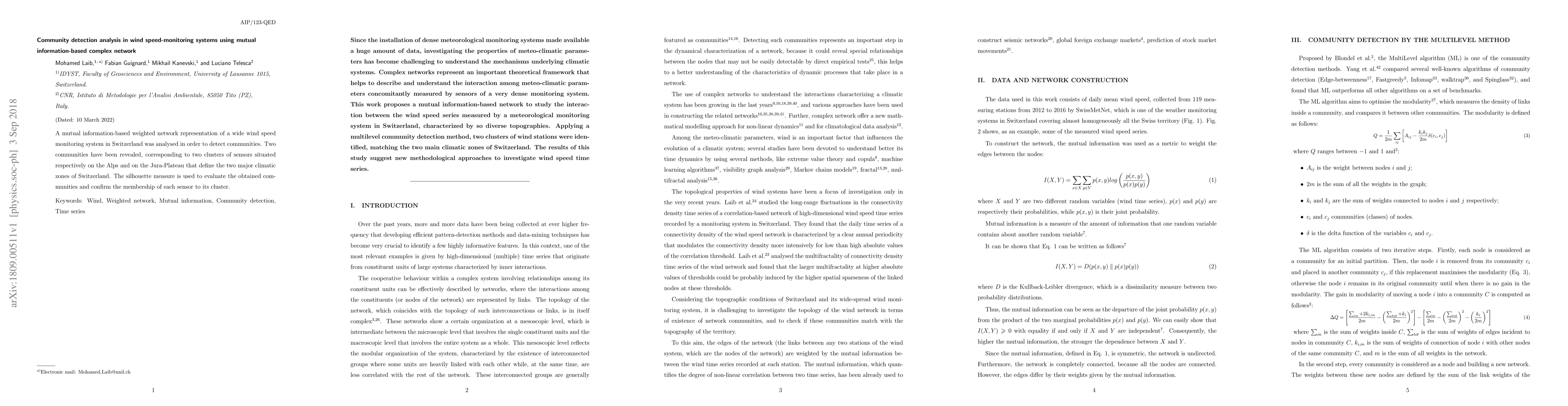This study employs mutual information to create a weighted network from a Swiss wind speed monitoring system, revealing two communities corresponding to sensor clusters on the Alps and Jura-Plateau. The silhouette measure validates the community structure and sensor membership.