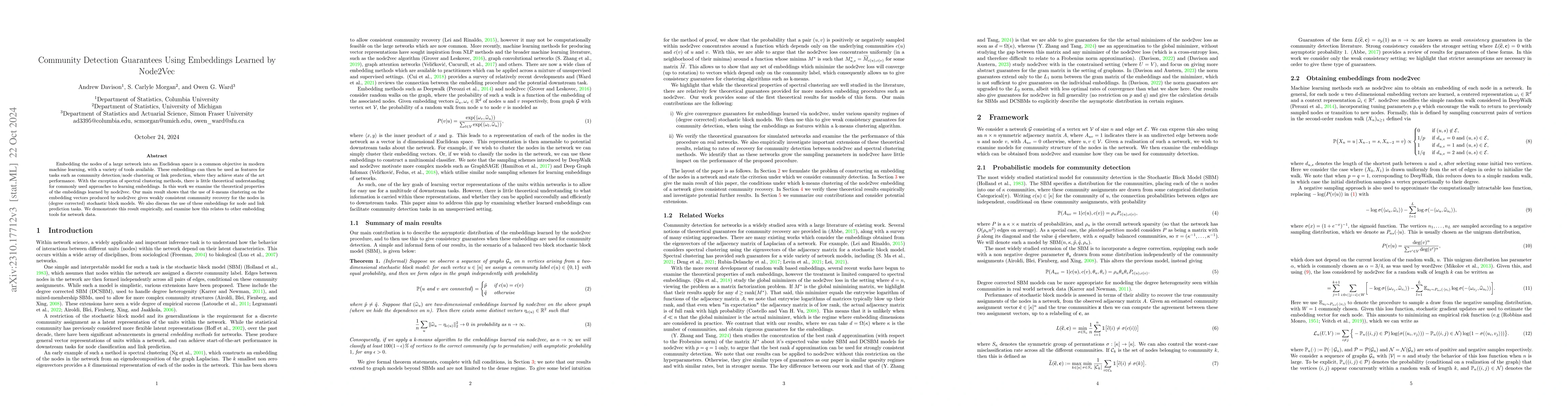 This paper investigates the theoretical properties of embeddings learned by Node2Vec for network analysis. It demonstrates that k-means clustering on Node2Vec embeddings can weakly recover communities in degree-corrected stochastic block models, providing a theoretical basis for their practical success in community detection.