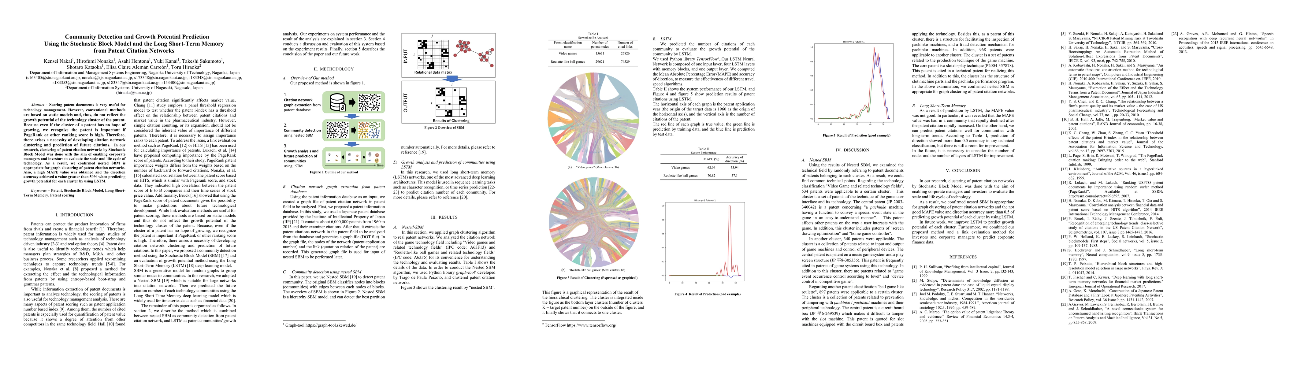 This research employs the Stochastic Block Model for clustering patent citation networks to assess technology clusters' growth potential, and Long Short-term Memory (LSTM) for predicting future citations. The study confirms the effectiveness of nested SBM for graph clustering and achieves over 50% direction accuracy in predicting growth potential using LSTM.