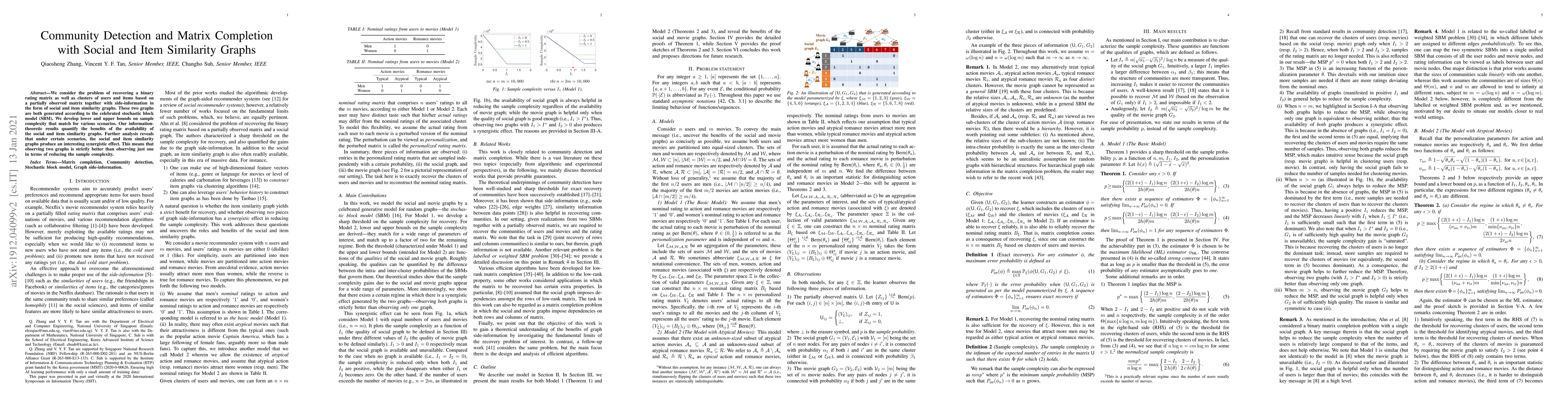 We consider the problem of recovering a binary rating matrix as well as clusters of users and items based on a partially observed matrix together with side-information in the form of social and item similarity graphs. These two graphs are both generated according to the celebrated stochastic block model (SBM). We develop lower and upper bounds on sample complexity that match for various scenarios. Our information-theoretic results quantify the benefits of the availability of the social and item similarity graphs. Further analysis reveals that under certain scenarios, the social and item similarity graphs produce an interesting synergistic effect. This means that observing two graphs is strictly better than observing just one in terms of reducing the sample complexity.
