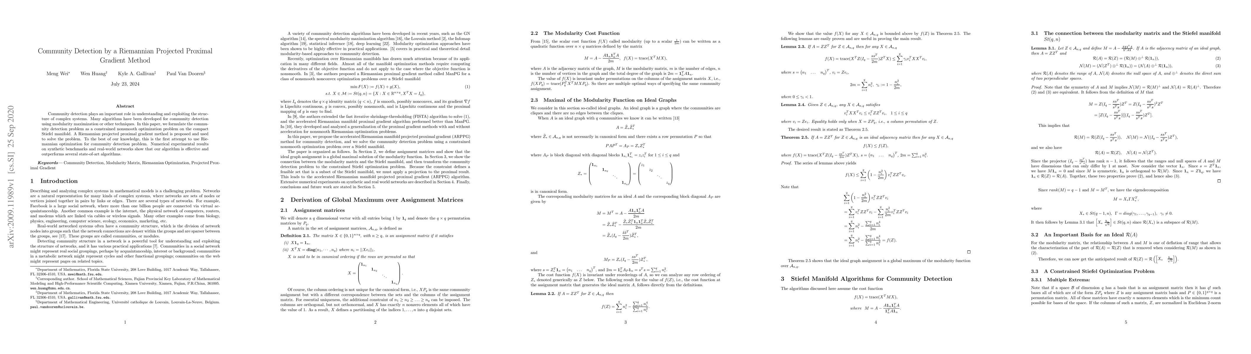 This paper proposes a Riemannian projected proximal gradient method to solve the community detection problem formulated as a constrained nonsmooth optimization on the Stiefel manifold. The method outperforms existing state-of-the-art algorithms in both synthetic and real-world network experiments.