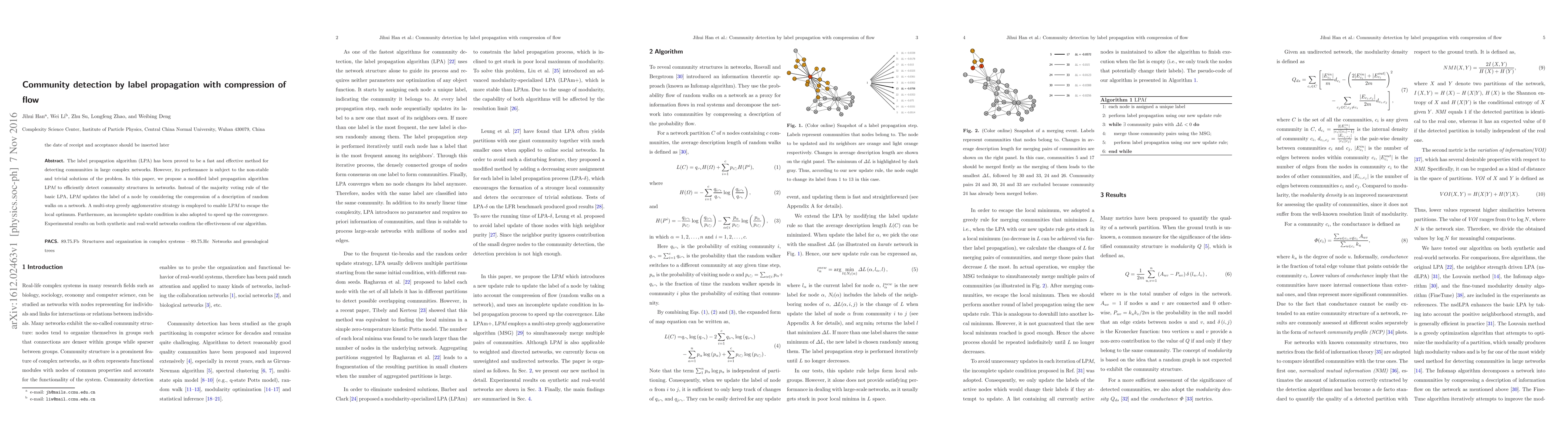 The label propagation algorithm (LPA) has been proved to be a fast and effective method for detecting communities in large complex networks. However, its performance is subject to the non-stable and trivial solutions of the problem. In this paper, we propose a modified label propagation algorithm LPAf to efficiently detect community structures in networks. Instead of the majority voting rule of the basic LPA, LPAf updates the label of a node by considering the compression of a description of random walks on a network. A multi-step greedy agglomerative strategy is employed to enable LPAf to escape the local optimum. Furthermore, an incomplete update condition is also adopted to speed up the convergence. Experimental results on both synthetic and real-world networks confirm the effectiveness of our algorithm.