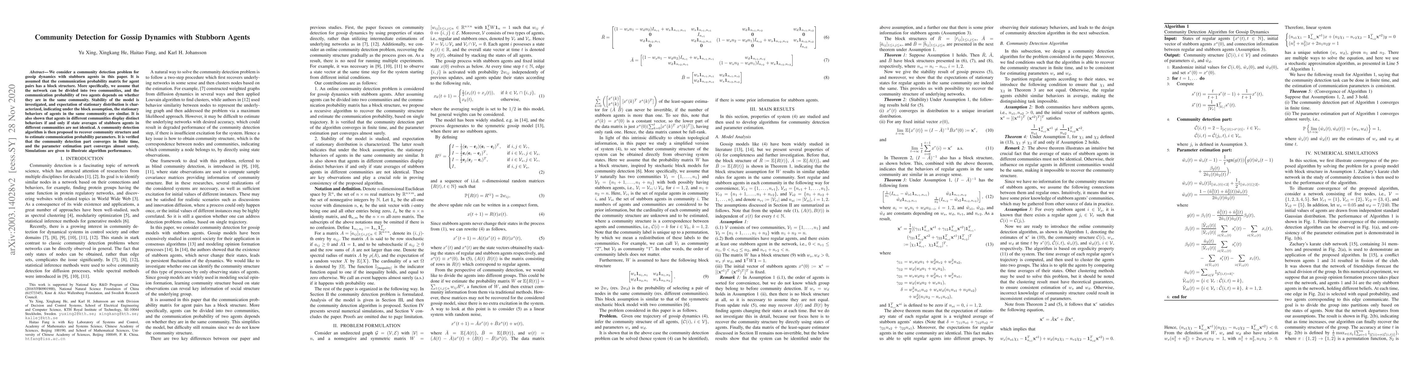 This paper investigates community detection in gossip dynamics with stubborn agents, where communication probabilities exhibit block structure. It proposes a community detection algorithm that converges in finite time and parameter estimation that converges almost surely, validated through simulations.