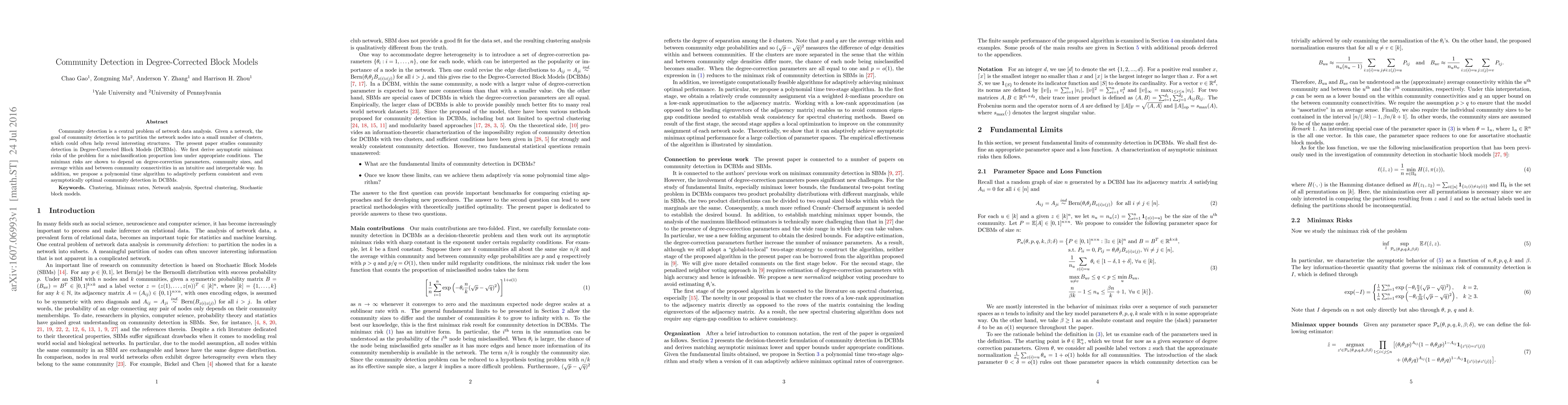 This paper investigates community detection in Degree-Corrected Block Models (DCBMs), deriving asymptotic minimax risks that depend on degree-correction parameters and community structures. It also proposes a polynomial time algorithm for consistent and asymptotically optimal community detection in DCBMs.
