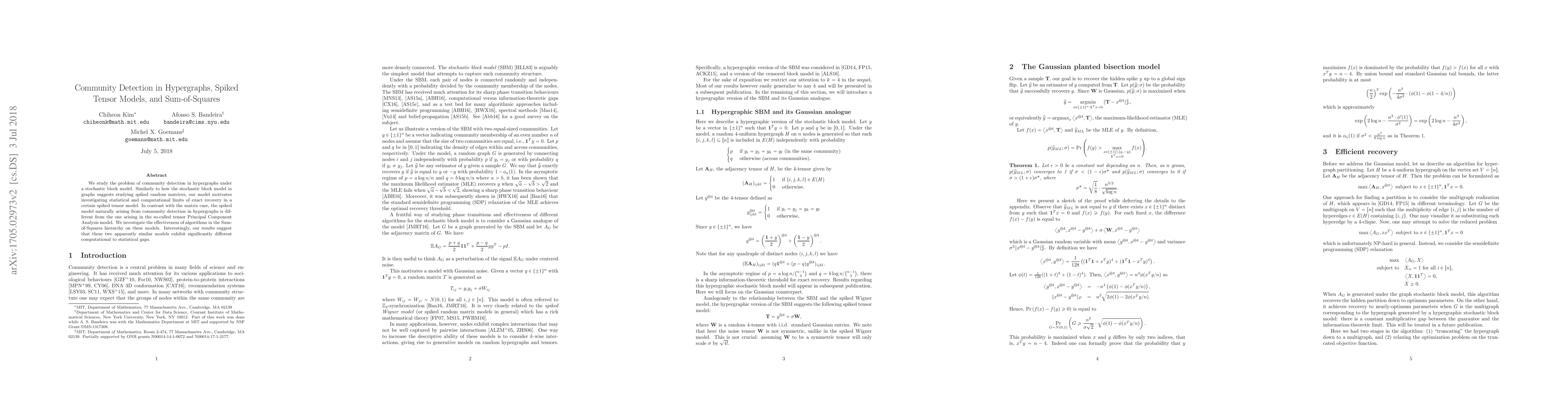 This paper explores community detection in hypergraphs under a stochastic block model, proposing a spiked tensor model for analysis. It finds that despite similarities, the computational and statistical limits of exact recovery in this tensor model differ significantly from those in tensor PCA models, with the Sum-of-Squares hierarchy showing varied effectiveness.