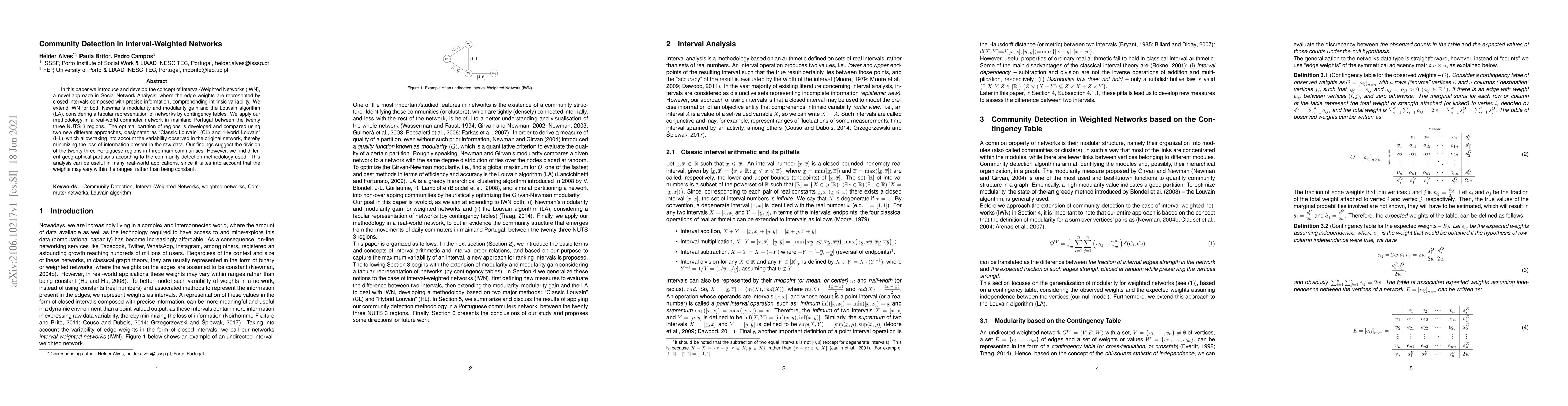 In this paper we introduce and develop the concept of Interval-Weighted Networks (IWN), a novel approach in Social Network Analysis, where the edge weights are represented by closed intervals composed with precise information, comprehending intrinsic variability. We extend IWN for both Newman's modularity and modularity gain and the Louvain algorithm (LA), considering a tabular representation of networks by contingency tables. We apply our methodology in a real-world commuter network in mainland Portugal between the twenty three NUTS 3 regions. The optimal partition of regions is developed and compared using two new different approaches, designated as ``Classic Louvain'' (CL) and ``Hybrid Louvain'' (HL), which allow taking into account the variability observed in the original network, thereby minimizing the loss of information present in the raw data. Our findings suggest the division of the twenty three Portuguese regions in three main communities. However, we find different geographical partitions according to the community detection methodology used. This analysis can be useful in many real-world applications, since it takes into account that the weights may vary within the ranges, rather than being constant.