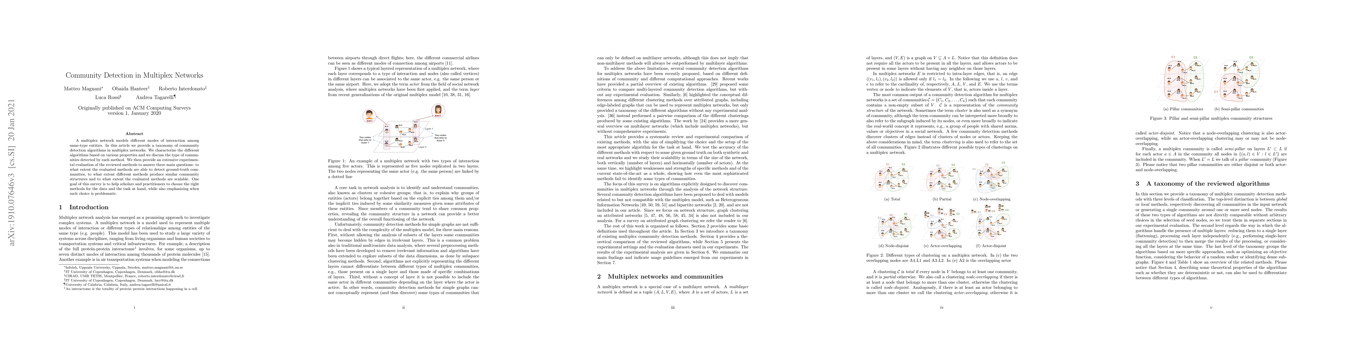 A multiplex network models different modes of interaction among same-type entities. In this article we provide a taxonomy of community detection algorithms in multiplex networks. We characterize the different algorithms based on various properties and we discuss the type of communities detected by each method. We then provide an extensive experimental evaluation of the reviewed methods to answer three main questions: to what extent the evaluated methods are able to detect ground-truth communities, to what extent different methods produce similar community structures and to what extent the evaluated methods are scalable. One goal of this survey is to help scholars and practitioners to choose the right methods for the data and the task at hand, while also emphasizing when such choice is problematic.