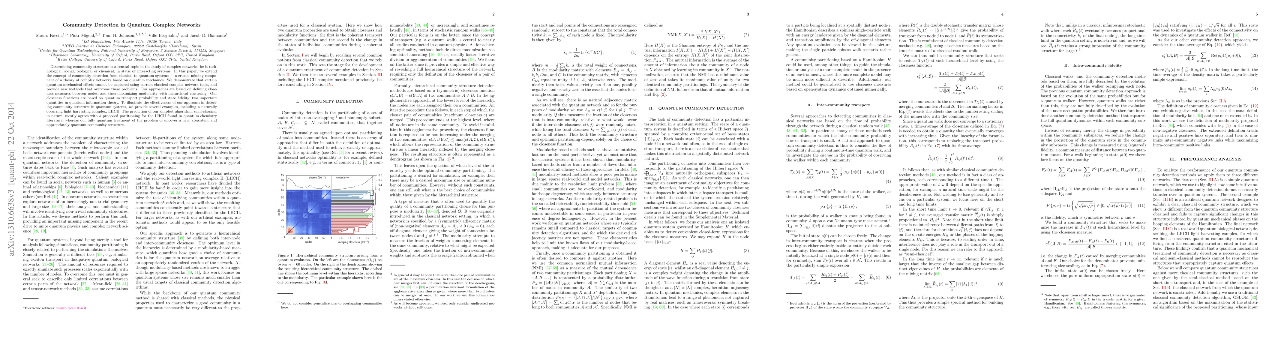 Determining community structure is a central topic in the study of complex networks, be it technological, social, biological or chemical, in static or interacting systems. In this paper, we extend the concept of community detection from classical to quantum systems---a crucial missing component of a theory of complex networks based on quantum mechanics. We demonstrate that certain quantum mechanical effects cannot be captured using current classical complex network tools and provide new methods that overcome these problems. Our approaches are based on defining closeness measures between nodes, and then maximizing modularity with hierarchical clustering. Our closeness functions are based on quantum transport probability and state fidelity, two important quantities in quantum information theory. To illustrate the effectiveness of our approach in detecting community structure in quantum systems, we provide several examples, including a naturally occurring light-harvesting complex, LHCII. The prediction of our simplest algorithm, semiclassical in nature, mostly agrees with a proposed partitioning for the LHCII found in quantum chemistry literature, whereas our fully quantum treatment of the problem uncovers a new, consistent, and appropriately quantum community structure.