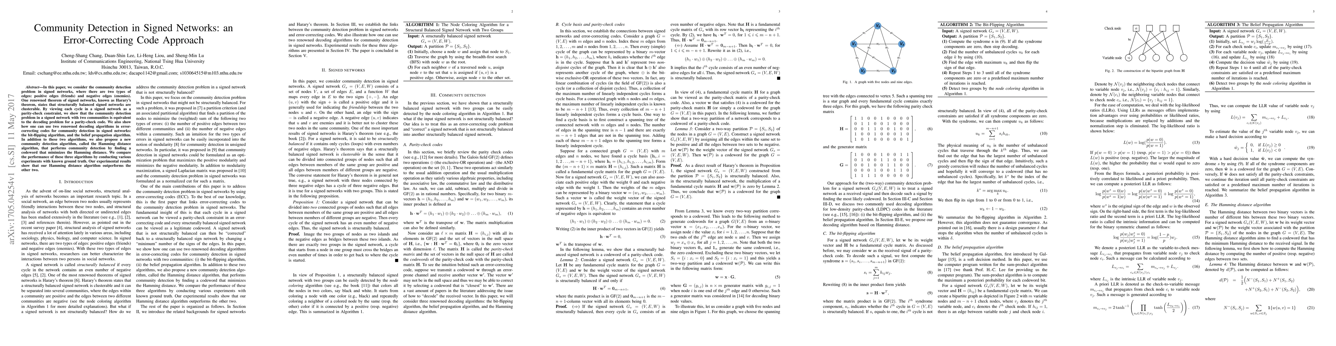 This paper explores community detection in signed networks using error-correcting code techniques. It proposes three algorithms—bit-flipping, belief propagation, and a new Hamming distance algorithm—to detect communities, demonstrating that the Hamming distance algorithm outperforms the others in experiments.