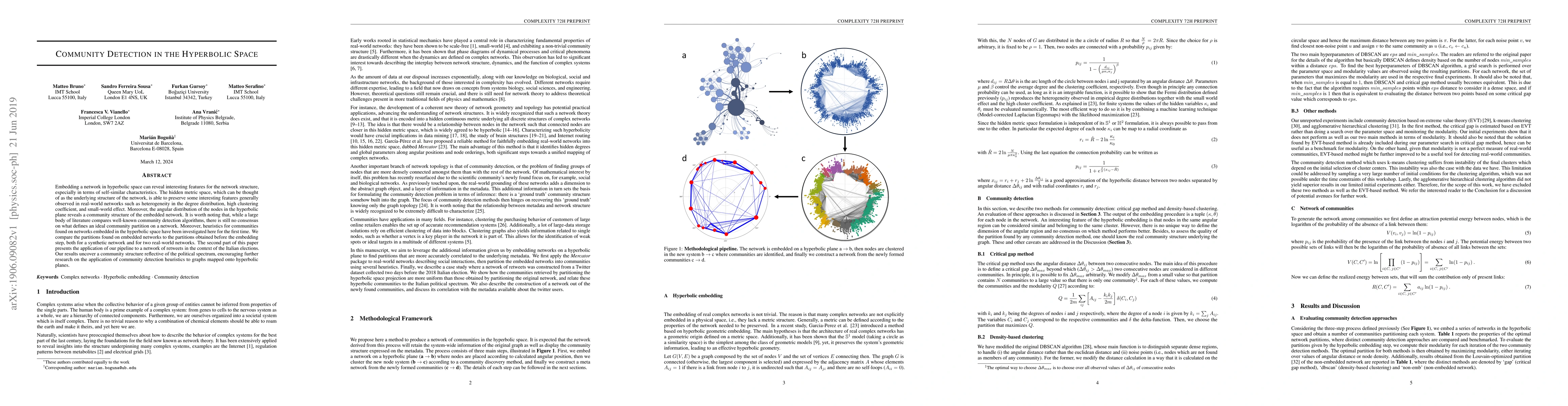 This paper explores community detection in networks embedded in hyperbolic space, revealing self-similar characteristics and preserving features like degree distribution heterogeneity. It introduces new heuristics for community detection in such spaces and compares results from synthetic and real-world networks, including a retweet network during Italian elections, highlighting a political spectrum community structure.