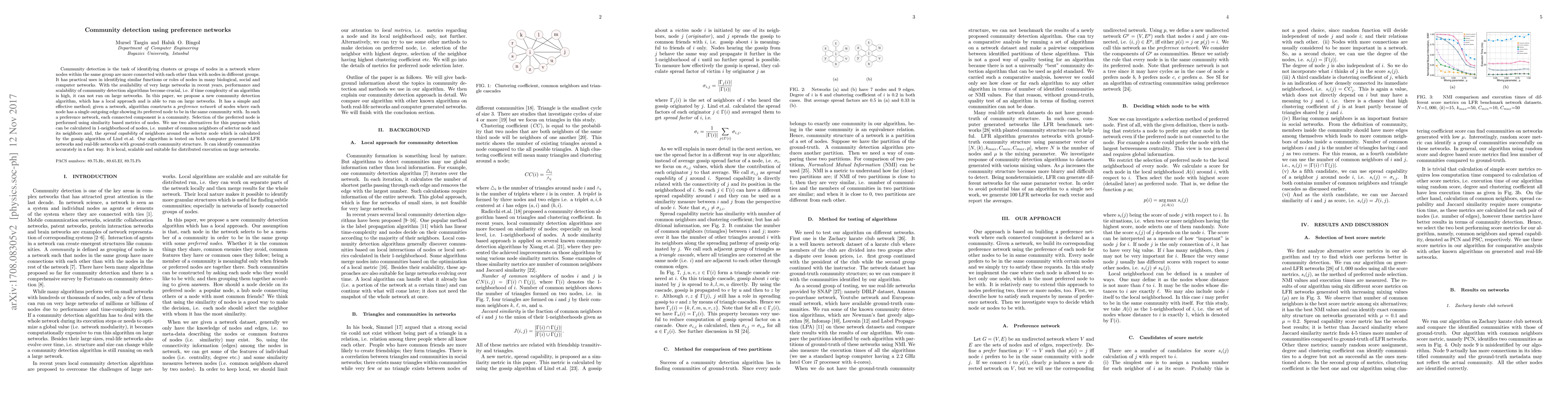 This paper proposes a new community detection algorithm based on preference networks, which identifies clusters by constructing a network where each node points to its preferred neighbor. The algorithm uses local similarity metrics to determine preferences and identifies communities as connected components in this preference network. It is efficient, scalable, and tested on both synthetic and real-world networks.