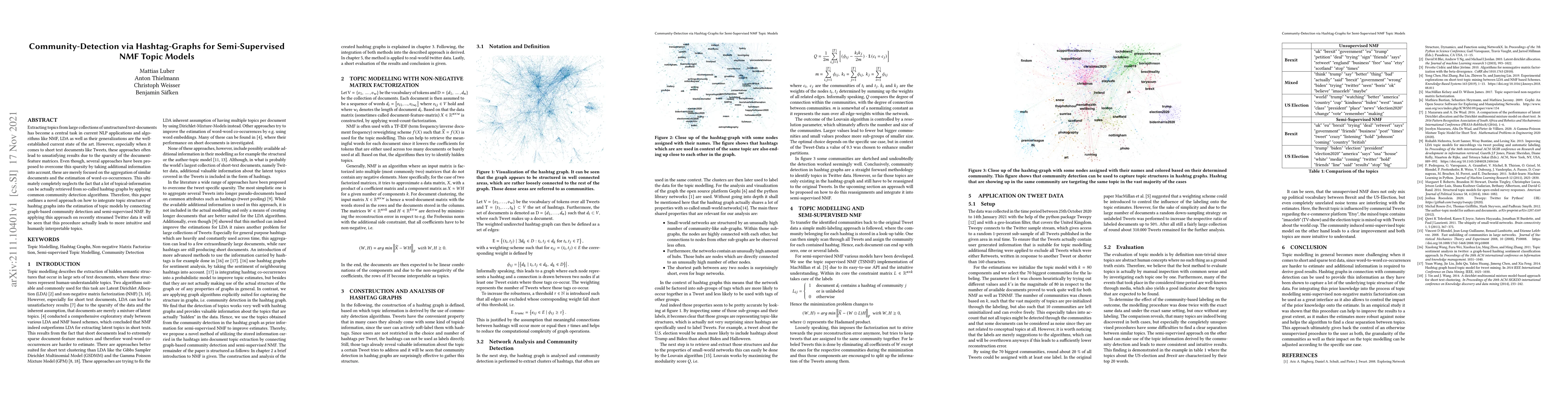 A new approach integrates community detection from hashtag-graphs into semi-supervised Non-negative Matrix Factorization (NMF) topic models to improve results on short text documents like Tweets. This integration leads to more intuitive and humanly interpretable topics in recent Twitter data analysis.