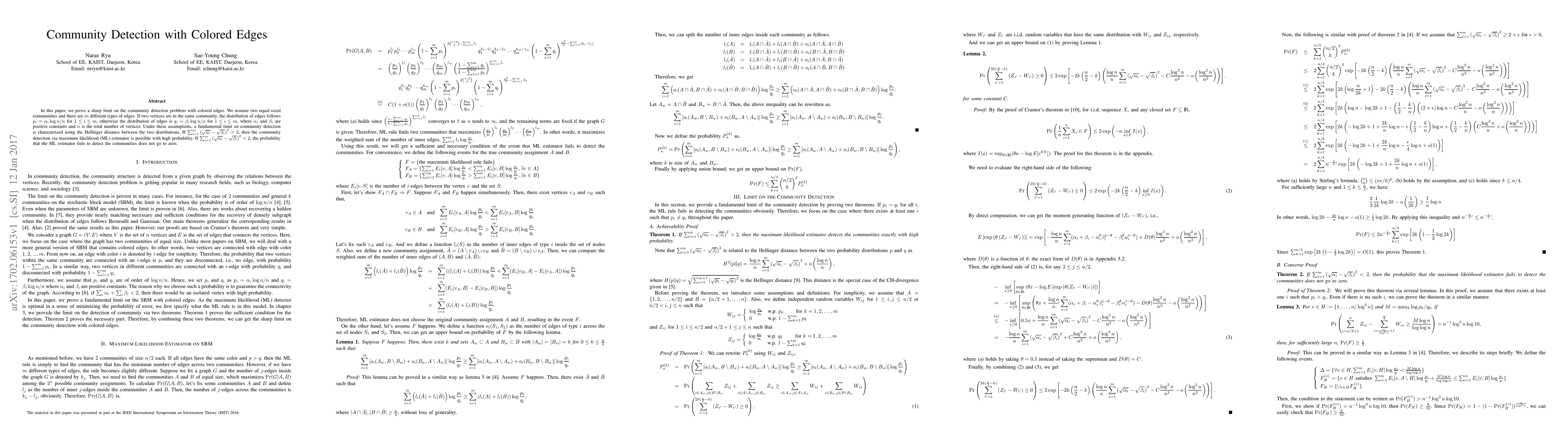 Researchers prove a sharp limit on community detection with colored edges, finding that if two communities have different edge distributions, the probability of successful detection increases beyond a certain threshold. If this threshold is not exceeded, the probability of failure does not decrease to zero.