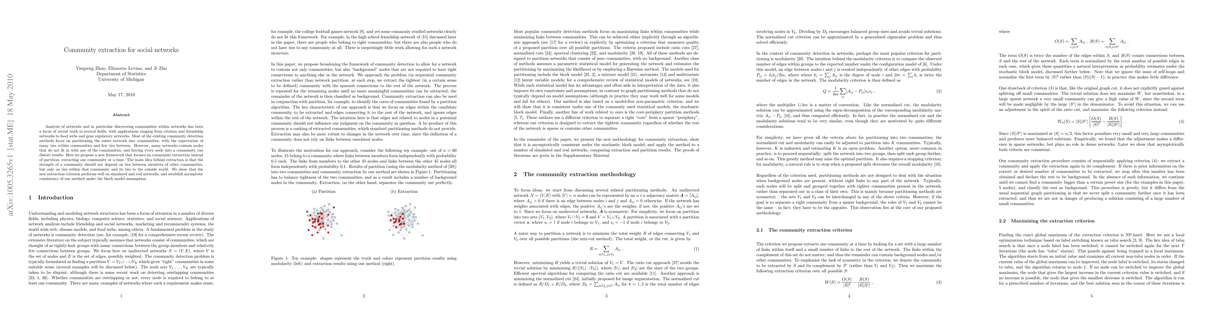 This paper proposes a novel framework for community extraction in social networks, focusing on extracting one community at a time rather than partitioning the entire network. The method emphasizes the strength of a community based on internal ties and external connections, rather than ties between different communities, and demonstrates its effectiveness on both simulated and real networks.