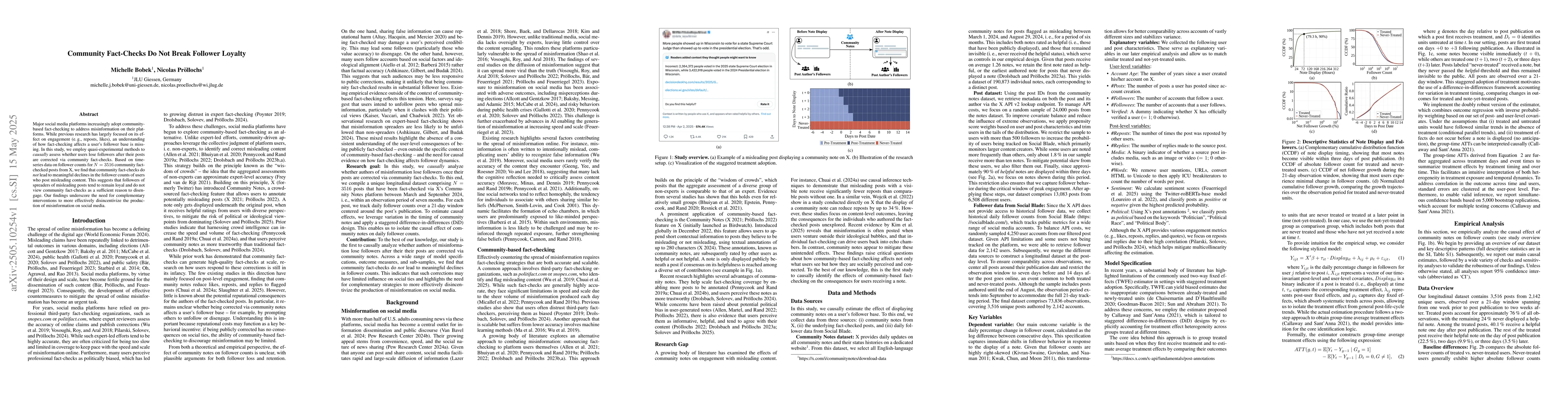 The study uses quasi-experimental methods and time-series data on follower counts for N=3516 community fact-checked posts to assess the impact of community fact-checks on user follower base.