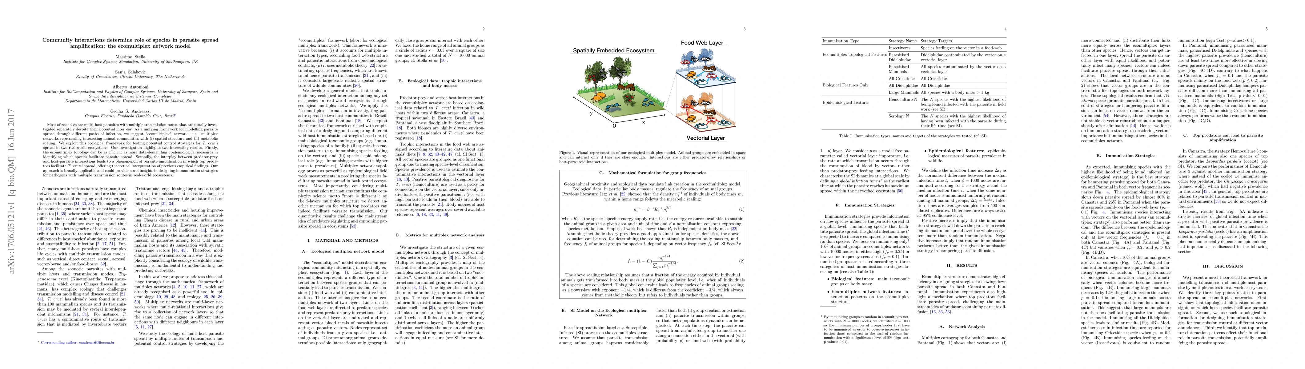 Most of zoonoses are multi-host parasites with multiple transmission routes that are usually investigated separately despite their potential interplay. As a unifying framework for modelling parasite spread through different paths of infection, we suggest "ecomultiplex" networks, i.e. multiplex networks representing interacting animal communities with (i) spatial structure and (ii) metabolic scaling. We exploit this ecological framework for testing potential control strategies for $T. cruzii$ spread in two real-world ecosystems. Our investigation highlights two interesting results. Firstly, the ecomultiplex topology can be as efficient as more data-demanding epidemiological measures in identifying which species facilitate parasite spread. Secondly, the interplay between predator-prey and host-parasite interactions leads to a phenomenon of parasite amplification in which top predators facilitate $T. cruzii$ spread, offering theoretical interpretation of previous empirical findings. Our approach is broadly applicable and could provide novel insights in designing immunisation strategies for pathogens with multiple transmission routes in real-world ecosystems.