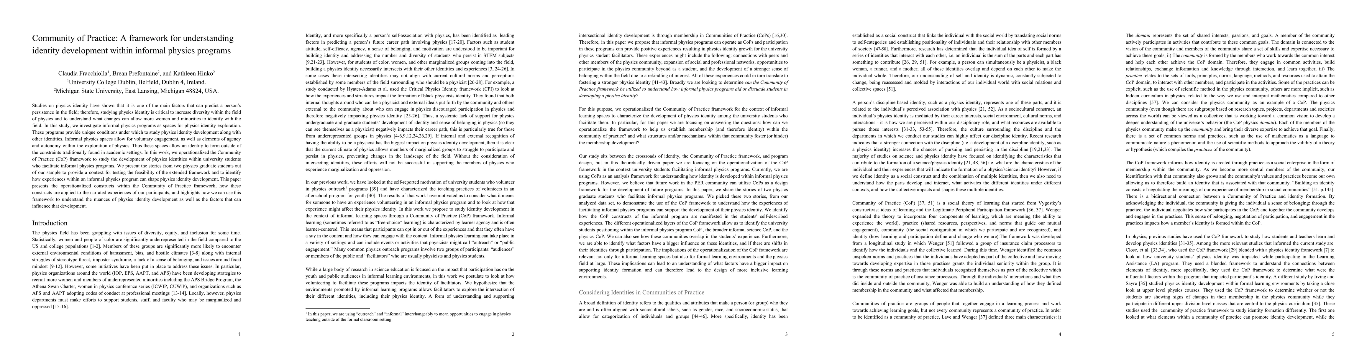 Studies on physics identity have shown that it is one of the main factors that can predict a person's persistence in the field; therefore, studying physics identity is critical to increase diversity within the field of physics and to understand what changes can allow more women and minorities to identify with the field. In this study, we investigate informal physics programs as spaces for physics identity exploration. These programs provide unique conditions under which to study physics identity development along with other identities. Informal physics spaces allow for voluntary engagement, as well as elements of agency and autonomy within the exploration of physics. Thus these spaces allow an identity to form outside of the constraints traditionally found in academic settings. In this work, we operationalized the Community of Practice (CoP) framework to study the development of physics identities within university students who facilitate informal physics programs. We present the stories from two physics graduate students out of our sample to provide a context for testing the feasibility of the extended framework and to identify how experiences within an informal physics program can shape physics identity development. This paper presents the operationalized constructs within the Community of Practice framework, how these constructs are applied to the narrated experiences of our participants, and highlights how we can use this framework to understand the nuances of physics identity development as well as the factors that can influence that development.
